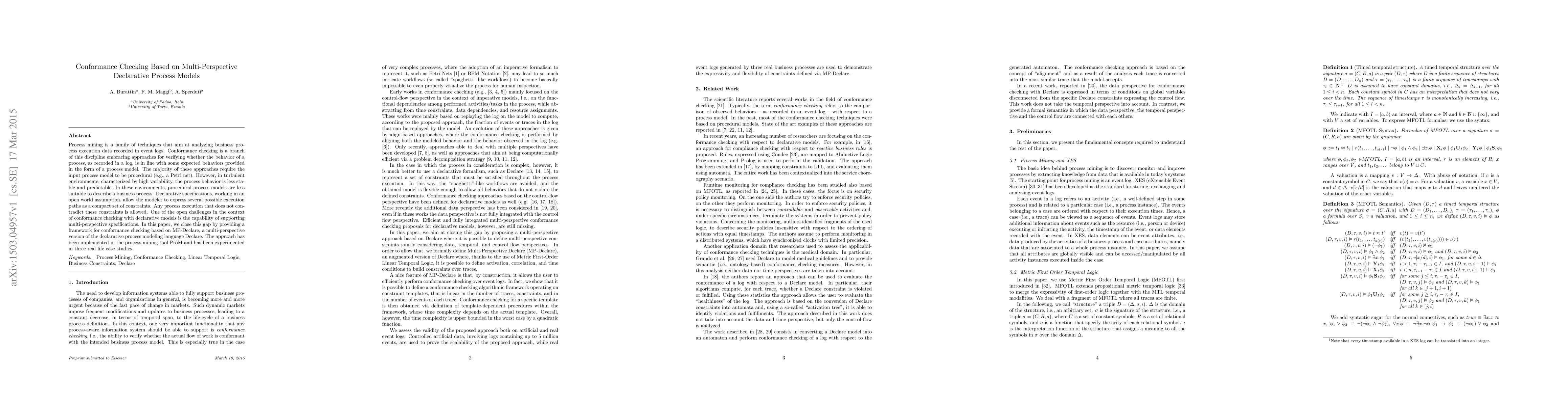 This paper presents a framework for conformance checking using MP-Declare, a multi-perspective declarative process modeling language, addressing the challenge of verifying process logs against flexible, constraint-based models. The framework was implemented in ProM and tested in three real-world case studies.