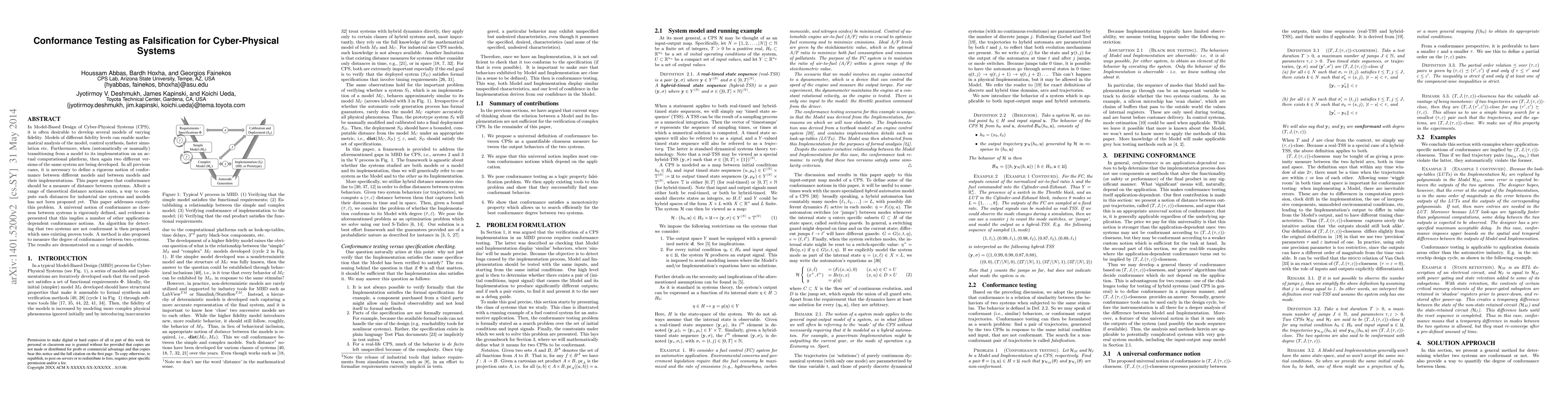 In Model-Based Design of Cyber-Physical Systems (CPS), it is often desirable to develop several models of varying fidelity. Models of different fidelity levels can enable mathematical analysis of the model, control synthesis, faster simulation etc. Furthermore, when (automatically or manually) transitioning from a model to its implementation on an actual computational platform, then again two different versions of the same system are being developed. In all previous cases, it is necessary to define a rigorous notion of conformance between different models and between models and their implementations. This paper argues that conformance should be a measure of distance between systems. Albeit a range of theoretical distance notions exists, a way to compute such distances for industrial size systems and models has not been proposed yet. This paper addresses exactly this problem. A universal notion of conformance as closeness between systems is rigorously defined, and evidence is presented that this implies a number of other application-dependent conformance notions. An algorithm for detecting that two systems are not conformant is then proposed, which uses existing proven tools. A method is also proposed to measure the degree of conformance between two systems. The results are demonstrated on a range of models.