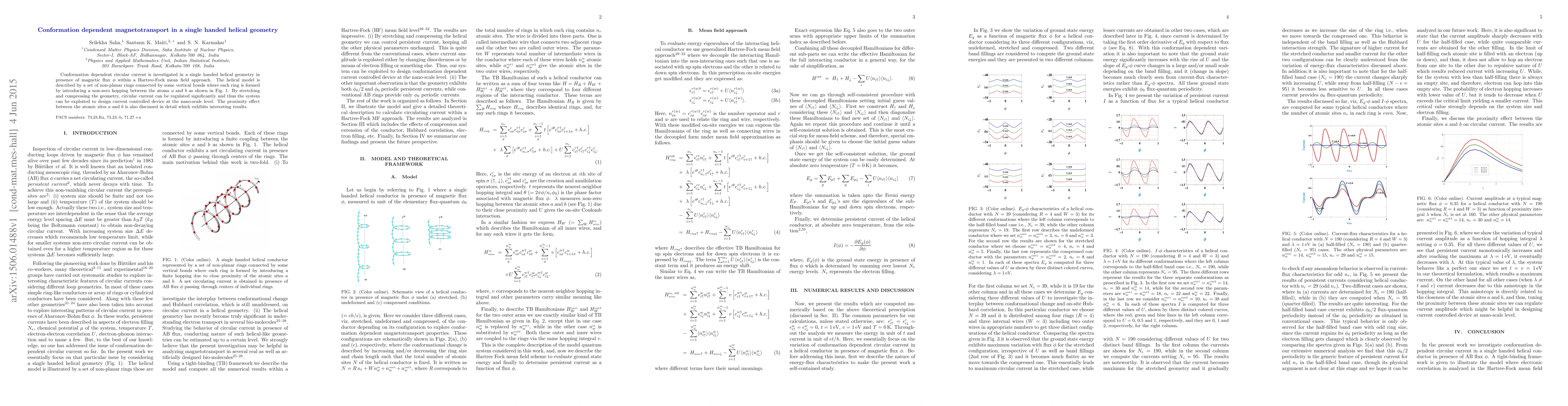 Conformation dependent circular current is investigated in a single handed helical geometry in presence of magnetic flux $\phi$ within a Hartree-Fock mean field approach. The helical model is described by a set of non-planar rings connected by some vertical bonds where each ring is formed by introducing a non-zero hopping between the atoms $a$ and $b$ as shown in Fig.1. By stretching and compressing the geometry, circular current can be regulated significantly and thus the system can be exploited to design current controlled device at the nano-scale level. The proximity effect between the atomic sites $a$ and $b$ is also discussed in detail which exhibits interesting results.