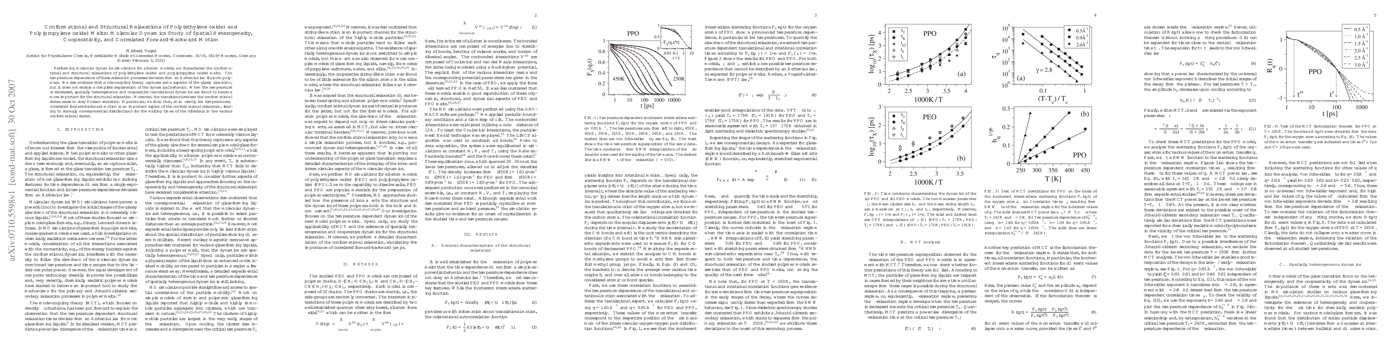 This paper uses molecular dynamics simulations to study the relaxation processes in poly(ethylene oxide) and poly(propylene oxide) melts, finding that their temperature-dependent relaxations deviate from Arrhenius behavior and that correlated forward-backward motion becomes significant at low temperatures, affecting conformational transitions.