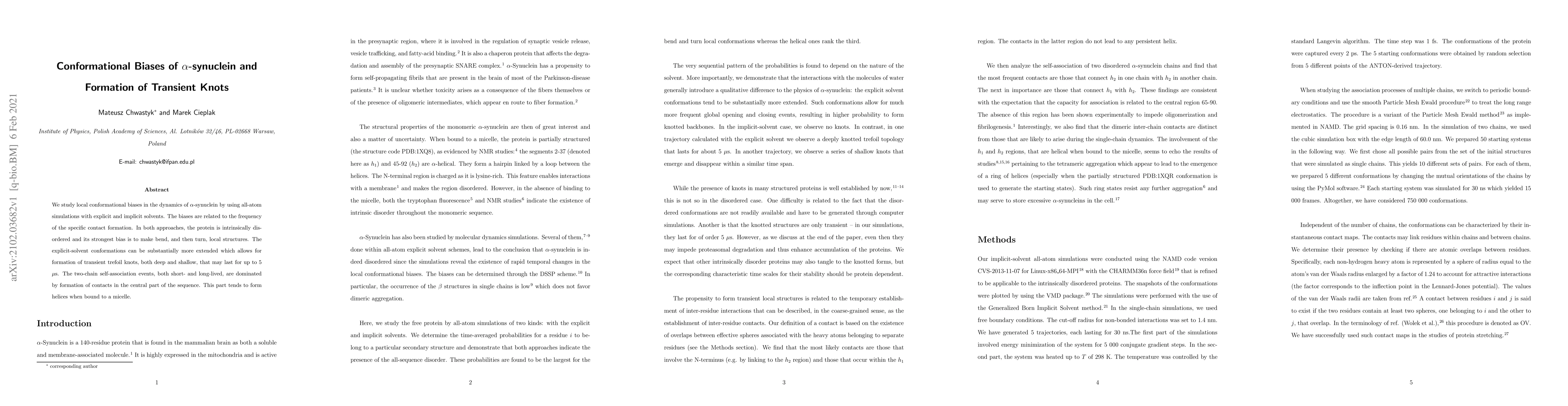 We study local conformational biases in the dynamics of {\alpha}-synuclein by using all-atom simulations with explicit and implicit solvents. The biases are related to the frequency of the specific contact formation. In both approaches, the protein is intrinsically disordered, and its strongest bias is to make bend and turn local structures. The explicit-solvent conformations can be substantially more extended which allows for formation of transient trefoil knots, both deep and shallow, that may last for up to 5 {\mu}s. The two-chain self-association events, both short- and long-lived, are dominated by formation of contacts in the central part of the sequence. This part tends to form helices when bound to a micelle.