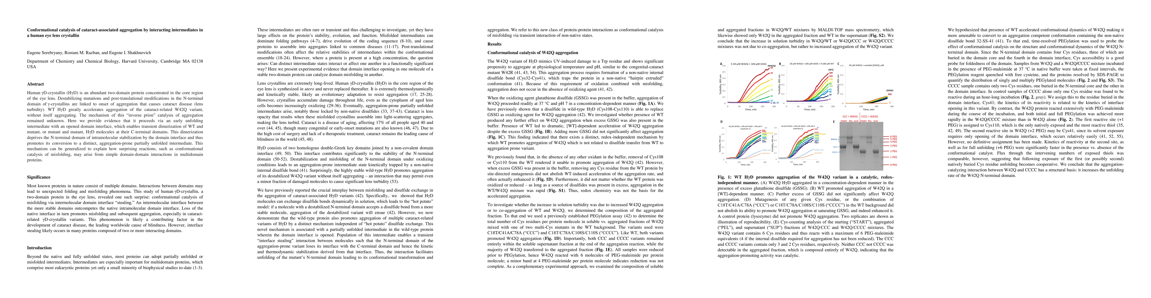 Researchers discovered a mechanism of misfolding in human eye lens crystallin, where interactions between protein domains can catalyze aggregation, contributing to cataract development. This phenomenon may occur in other proteins with multiple interacting domains.
