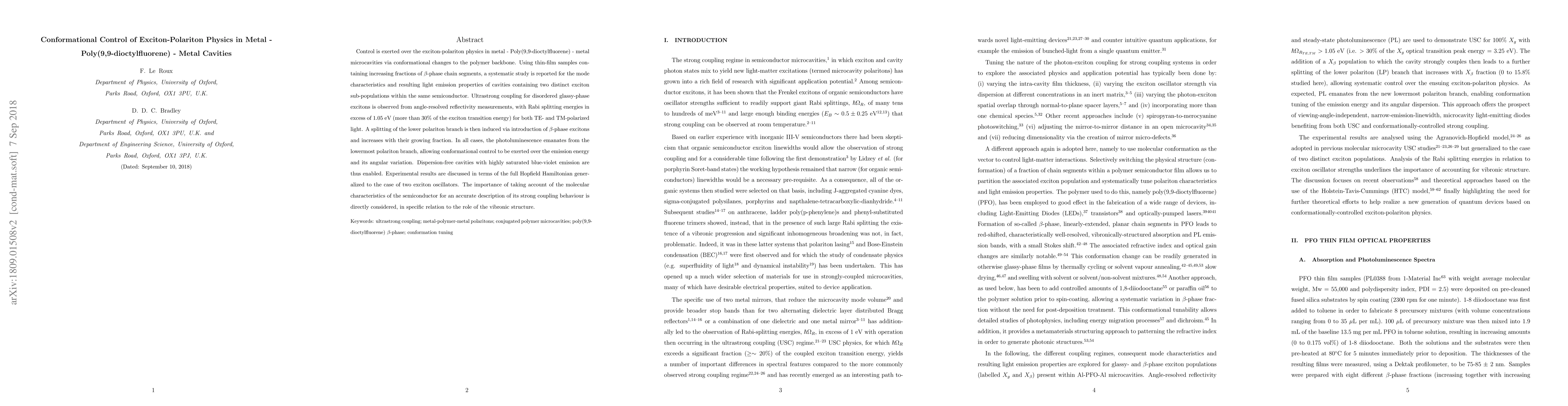 Control is exerted over the exciton-polariton physics in metal - Poly(9,9-dioctyl fluorene) - metal microcavities via conformational changes to the polymer backbone. Using thin-film samples containing increasing fractions of $\beta$-phase chain segments, a systematic study is reported for the mode characteristics and resulting light emission properties of cavities containing two distinct exciton sub-populations within the same semiconductor. Ultrastrong coupling for disordered glassy-phase excitons is observed from angle-resolved reflectivity measurements, with Rabi splitting energies in excess of 1.05 eV (more than 30% of the exciton transition energy) for both TE- and TM-polarized light. A splitting of the lower polariton branch is then induced via introduction of $\beta$-phase excitons and increases with their growing fraction. In all cases, the photoluminescence emanates from the lowermost polariton branch, allowing conformational control to be exerted over the emission energy and its angular variation. Dispersion-free cavities with highly saturated blue-violet emission are thus enabled. Experimental results are discussed in terms of the full Hopfield Hamiltonian generalized to the case of two exciton oscillators. The importance of taking account of the molecular characteristics of the semiconductor for an accurate description of its strong coupling behaviour is directly considered, in specific relation to the role of the vibronic structure.
