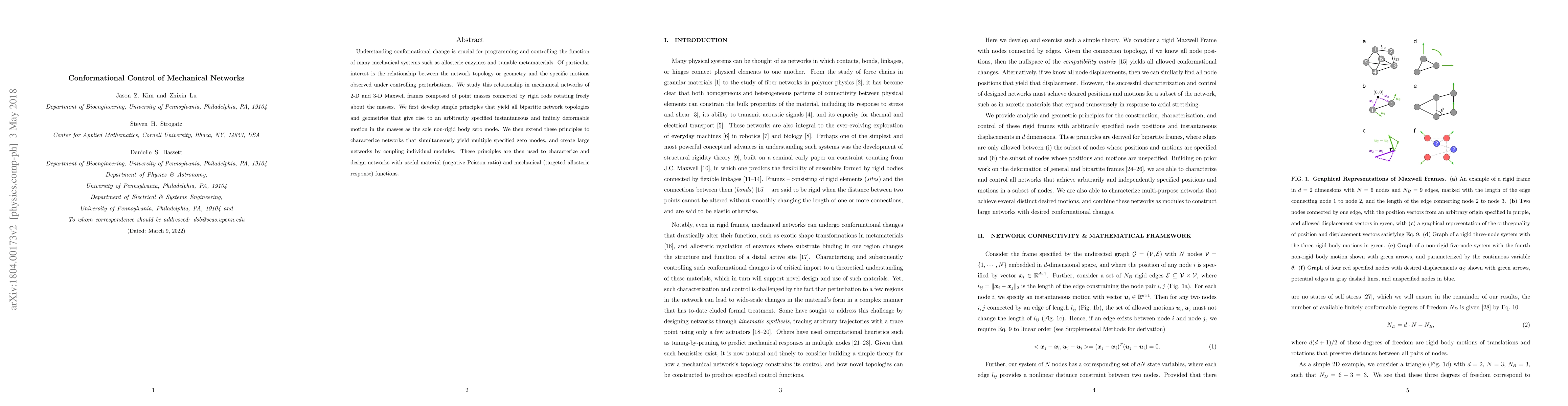 This research develops principles to control mechanical network motions via conformational changes, identifying topologies that generate specific deformations in 2D and 3D Maxwell frames. It extends these principles to networks with multiple zero modes and large-scale assemblies, enabling the design of materials with tailored properties like negative Poisson ratio and targeted allosteric response.