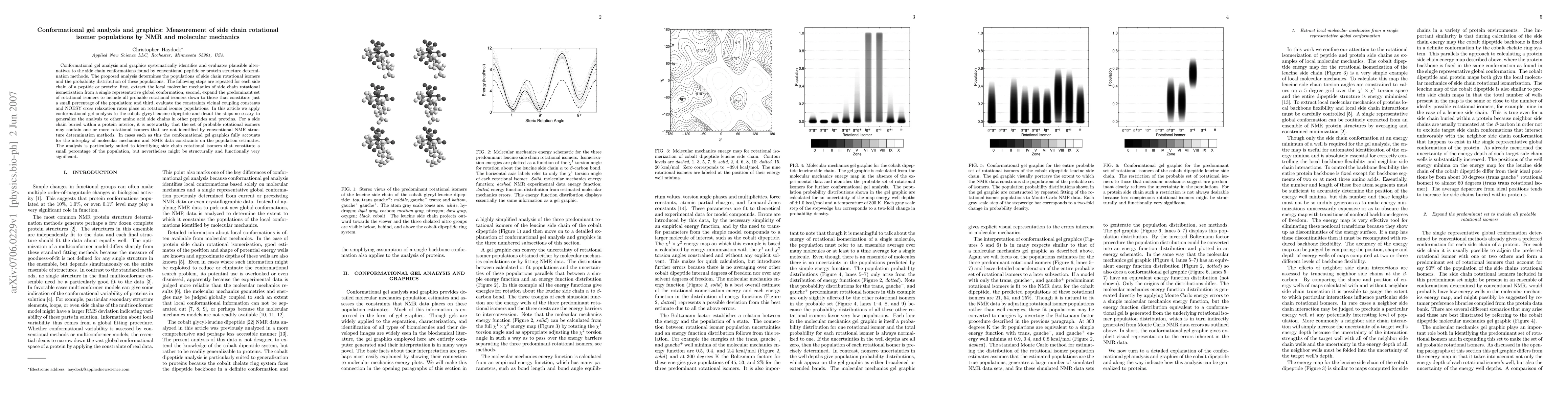 Conformational gel analysis and graphics systematically identifies and evaluates plausible alternatives to the side chain conformations found by conventional peptide or protein structure determination methods. The proposed analysis determines the populations of side chain rotational isomers and the probability distribution of these populations. The following steps are repeated for each side chain of a peptide or protein: first, extract the local molecular mechanics of side chain rotational isomerization from a single representative global conformation; second, expand the predominant set of rotational isomers to include all probable rotational isomers down to those that constitute just a small percentage of the population; and third, evaluate the constraints vicinal coupling constants and NOESY cross relaxation rates place on rotational isomer populations. In this article we apply conformational gel analysis to the cobalt glycyl-leucine dipeptide and detail the steps necessary to generalize the analysis to other amino acid side chains in other peptides and proteins. For a side chain buried within a protein interior, it is noteworthy that the set of probable rotational isomers may contain one or more rotational isomers that are not identified by conventional NMR structure determination methods. In cases such as this the conformational gel graphics fully accounts for the interplay of molecular mechanics and NMR data constraints on the population estimates. The analysis is particularly suited to identifying side chain rotational isomers that constitute a small percentage of the population, but nevertheless might be structurally and functionally very significant.