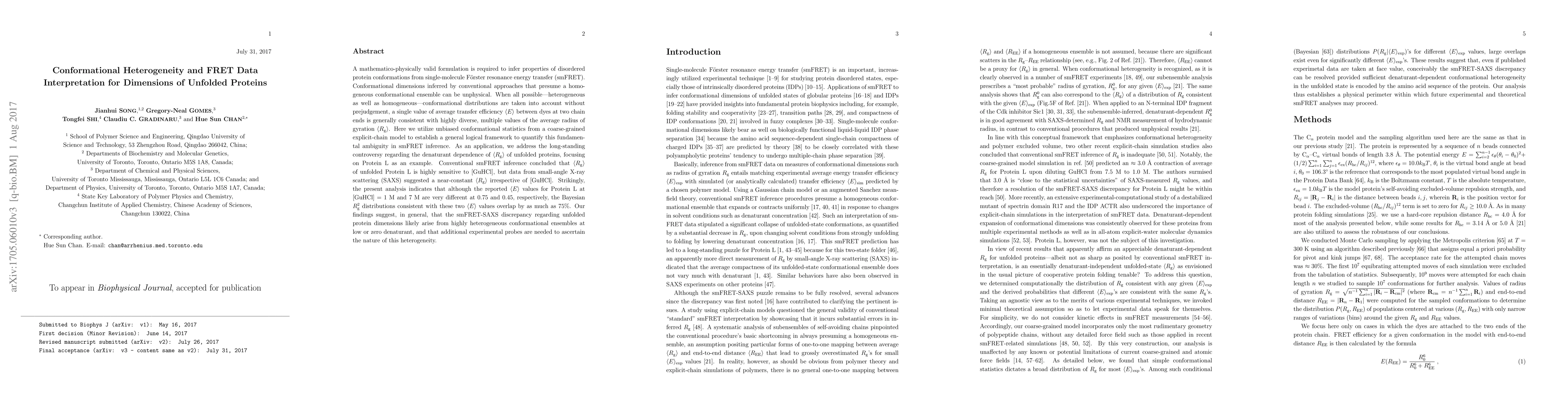 This paper proposes a new mathematical framework to interpret single-molecule FRET data for unfolded proteins, highlighting the ambiguity in inferring conformational dimensions due to conformational heterogeneity. It resolves the discrepancy between FRET and SAXS measurements for Protein L, suggesting that the heterogeneity in protein conformations at low denaturant concentrations leads to differing FRET results but similar SAXS outcomes.