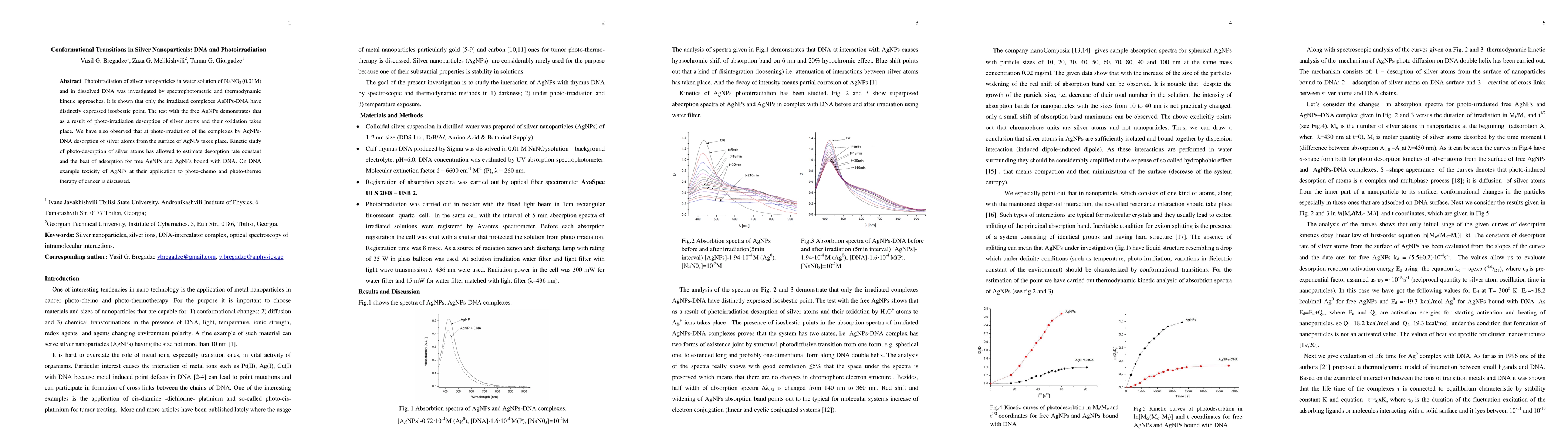 This study investigates the conformational transitions of silver nanoparticles (AgNPs) under photoirradiation in the presence of DNA and NaNO3, revealing distinct isosbestic points in AgNPs-DNA complexes. Photoirradiation leads to the desorption and oxidation of silver atoms from both free AgNPs and AgNPs bound to DNA, with kinetic studies estimating desorption rates and adsorption heats. The research also discusses the potential toxicity of AgNPs in photo-chemo and photo-thermo cancer therapies.