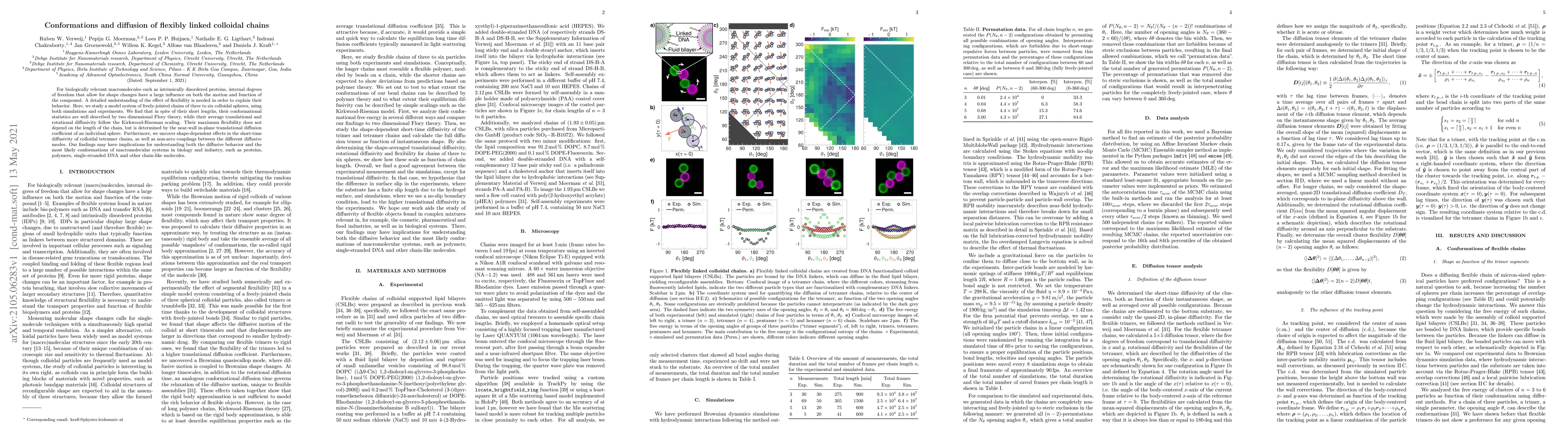 For biologically relevant macromolecules such as intrinsically disordered proteins, internal degrees of freedom that allow for shape changes have a large influence on both the motion and function of the compound. A detailed understanding of the effect of flexibility is needed in order to explain their behavior. Here, we study a model system of freely-jointed chains of three to six colloidal spheres, using both simulations and experiments. We find that in spite of their short lengths, their conformational statistics are well described by two-dimensional Flory theory, while their average translational and rotational diffusivity follow the Kirkwood-Riseman scaling. Their maximum flexibility does not depend on the length of the chain, but is determined by the near-wall in-plane translational diffusion coefficient of an individual sphere. Furthermore, we uncover shape-dependent effects in the short-time diffusivity of colloidal tetramer chains, as well as non-zero couplings between the different diffusive modes. Our findings may have implications for understanding both the diffusive behavior and the most likely conformations of macromolecular systems in biology and industry, such as proteins, polymers, single-stranded DNA and other chain-like molecules.