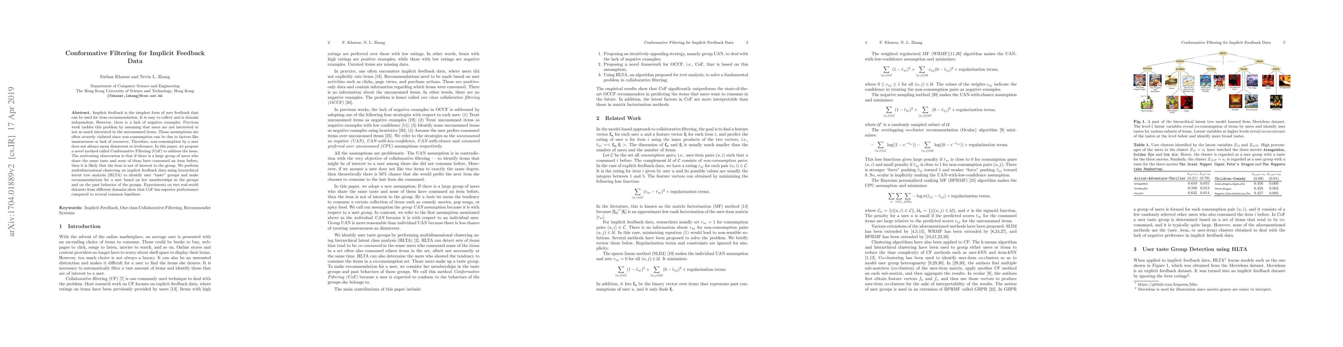 Implicit feedback is the simplest form of user feedback that can be used for item recommendation. It is easy to collect and is domain independent. However, there is a lack of negative examples. Previous work tackles this problem by assuming that users are not interested or not as much interested in the unconsumed items. Those assumptions are often severely violated since non-consumption can be due to factors like unawareness or lack of resources. Therefore, non-consumption by a user does not always mean disinterest or irrelevance. In this paper, we propose a novel method called Conformative Filtering (CoF) to address the issue. The motivating observation is that if there is a large group of users who share the same taste and none of them have consumed an item before, then it is likely that the item is not of interest to the group. We perform multidimensional clustering on implicit feedback data using hierarchical latent tree analysis (HLTA) to identify user `tastes' groups and make recommendations for a user based on her memberships in the groups and on the past behavior of the groups. Experiments on two real-world datasets from different domains show that CoF has superior performance compared to several common baselines.