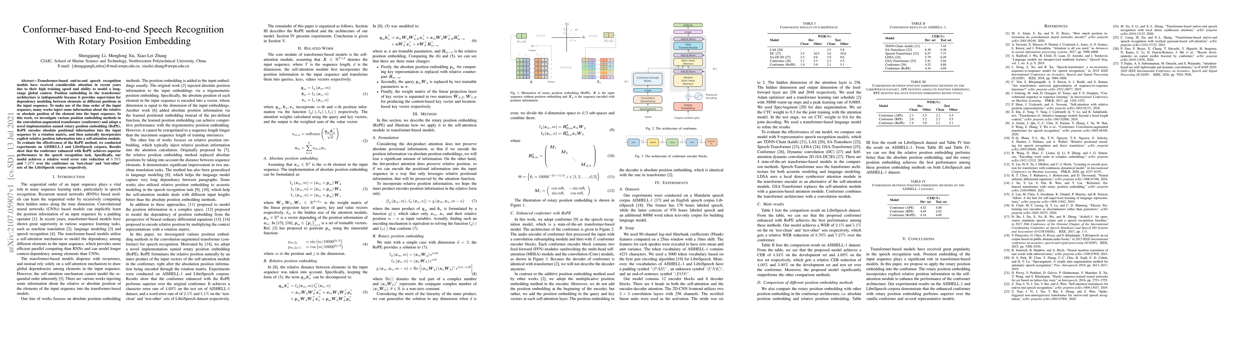 This paper explores the use of rotary position embedding (RoPE) in conformer-based end-to-end speech recognition models, achieving superior performance over traditional conformers. Experiments on AISHELL-1 and LibriSpeech corpora demonstrate an 8.70% and 7.27% relative word error rate reduction on LibriSpeech, respectively.