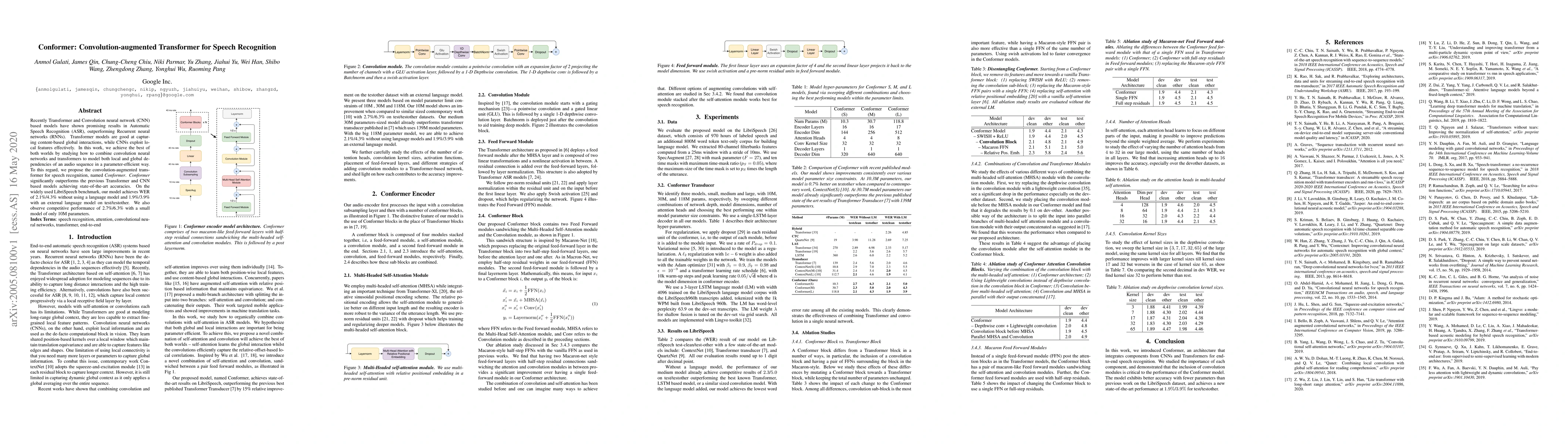 Recently Transformer and Convolution neural network (CNN) based models have shown promising results in Automatic Speech Recognition (ASR), outperforming Recurrent neural networks (RNNs). Transformer models are good at capturing content-based global interactions, while CNNs exploit local features effectively. In this work, we achieve the best of both worlds by studying how to combine convolution neural networks and transformers to model both local and global dependencies of an audio sequence in a parameter-efficient way. To this regard, we propose the convolution-augmented transformer for speech recognition, named Conformer. Conformer significantly outperforms the previous Transformer and CNN based models achieving state-of-the-art accuracies. On the widely used LibriSpeech benchmark, our model achieves WER of 2.1%/4.3% without using a language model and 1.9%/3.9% with an external language model on test/testother. We also observe competitive performance of 2.7%/6.3% with a small model of only 10M parameters.