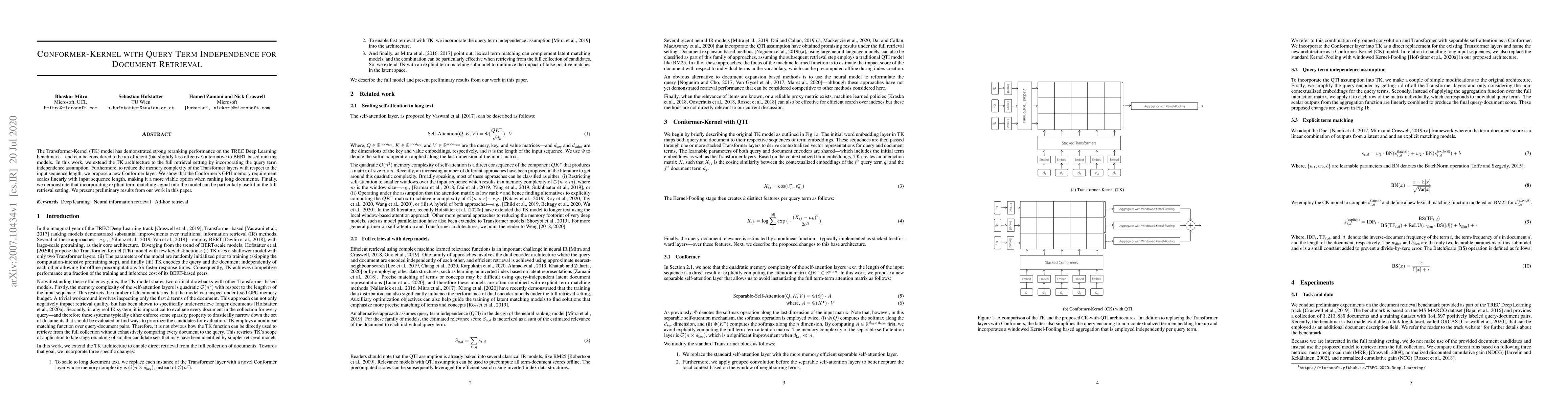 The Transformer-Kernel (TK) model has demonstrated strong reranking performance on the TREC Deep Learning benchmark---and can be considered to be an efficient (but slightly less effective) alternative to BERT-based ranking models. In this work, we extend the TK architecture to the full retrieval setting by incorporating the query term independence assumption. Furthermore, to reduce the memory complexity of the Transformer layers with respect to the input sequence length, we propose a new Conformer layer. We show that the Conformer's GPU memory requirement scales linearly with input sequence length, making it a more viable option when ranking long documents. Finally, we demonstrate that incorporating explicit term matching signal into the model can be particularly useful in the full retrieval setting. We present preliminary results from our work in this paper.