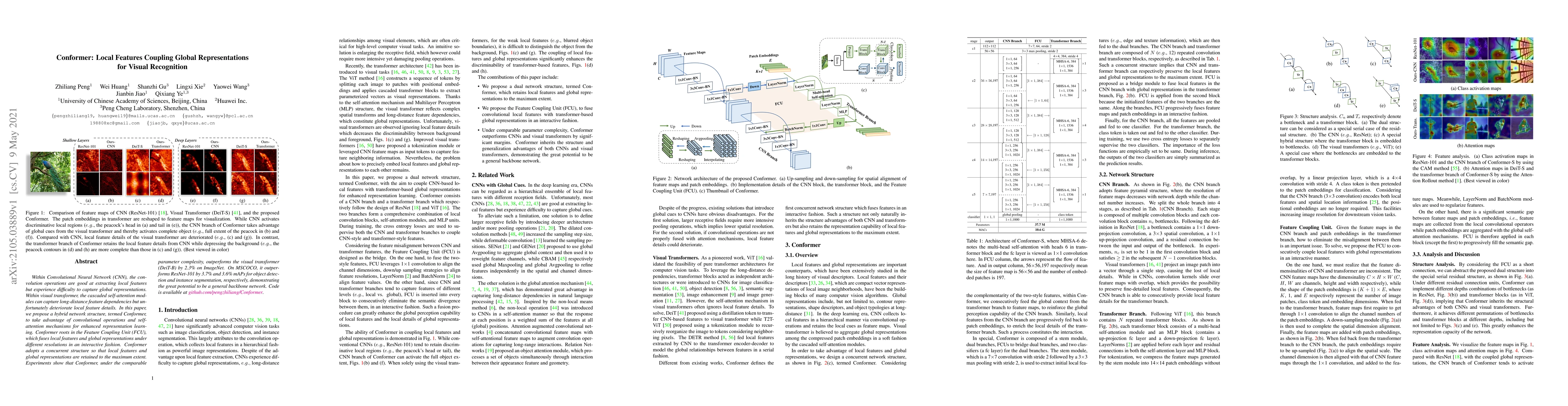 Within Convolutional Neural Network (CNN), the convolution operations are good at extracting local features but experience difficulty to capture global representations. Within visual transformer, the cascaded self-attention modules can capture long-distance feature dependencies but unfortunately deteriorate local feature details. In this paper, we propose a hybrid network structure, termed Conformer, to take advantage of convolutional operations and self-attention mechanisms for enhanced representation learning. Conformer roots in the Feature Coupling Unit (FCU), which fuses local features and global representations under different resolutions in an interactive fashion. Conformer adopts a concurrent structure so that local features and global representations are retained to the maximum extent. Experiments show that Conformer, under the comparable parameter complexity, outperforms the visual transformer (DeiT-B) by 2.3% on ImageNet. On MSCOCO, it outperforms ResNet-101 by 3.7% and 3.6% mAPs for object detection and instance segmentation, respectively, demonstrating the great potential to be a general backbone network. Code is available at https://github.com/pengzhiliang/Conformer.