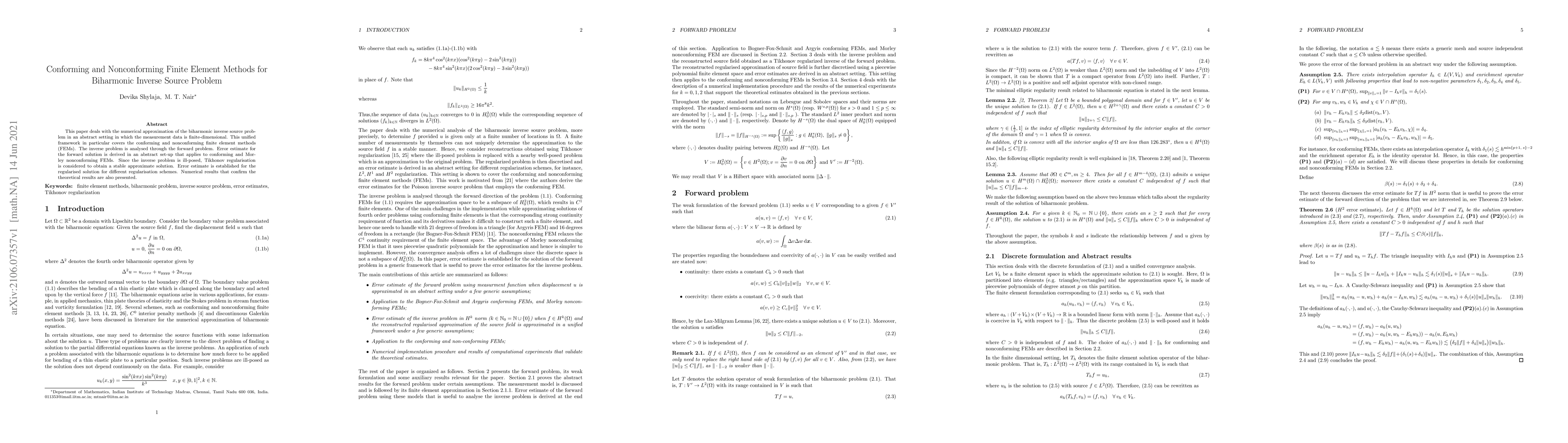 This paper investigates numerical methods for solving the biharmonic inverse source problem using conforming and nonconforming finite element methods, deriving error estimates for both forward and regularised solutions. Tikhonov regularisation is applied to address the ill-posed nature of the inverse problem, with numerical results validating the theoretical findings.