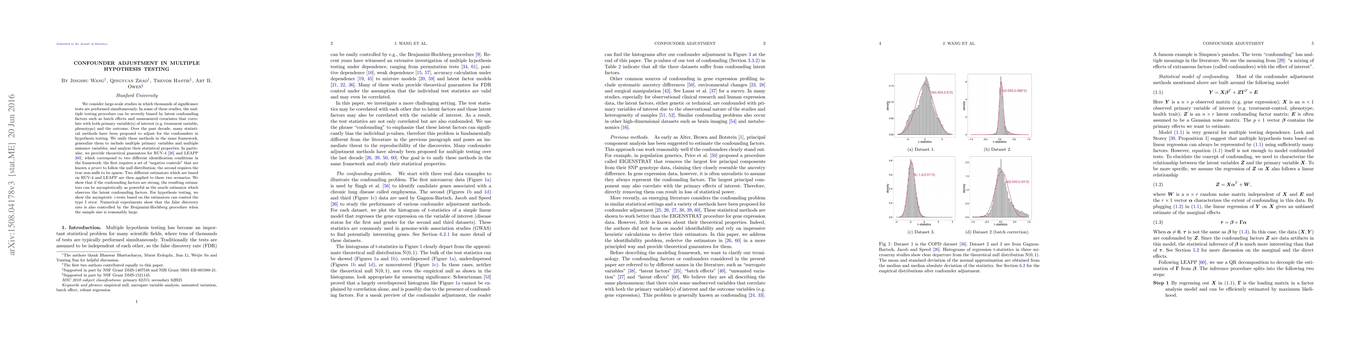 We consider large-scale studies in which thousands of significance tests are performed simultaneously. In some of these studies, the multiple testing procedure can be severely biased by latent confounding factors such as batch effects and unmeasured covariates that correlate with both primary variable(s) of interest (e.g. treatment variable, phenotype) and the outcome. Over the past decade, many statistical methods have been proposed to adjust for the confounders in hypothesis testing. We unify these methods in the same framework, generalize them to include multiple primary variables and multiple nuisance variables, and analyze their statistical properties. In particular, we provide theoretical guarantees for RUV-4 and LEAPP, which correspond to two different identification conditions in the framework: the first requires a set of "negative controls" that are known a priori to follow the null distribution; the second requires the true non-nulls to be sparse. Two different estimators which are based on RUV-4 and LEAPP are then applied to these two scenarios. We show that if the confounding factors are strong, the resulting estimators can be asymptotically as powerful as the oracle estimator which observes the latent confounding factors. For hypothesis testing, we show the asymptotic z-tests based on the estimators can control the type I error. Numerical experiments show that the false discovery rate is also controlled by the Benjamini-Hochberg procedure when the sample size is reasonably large.