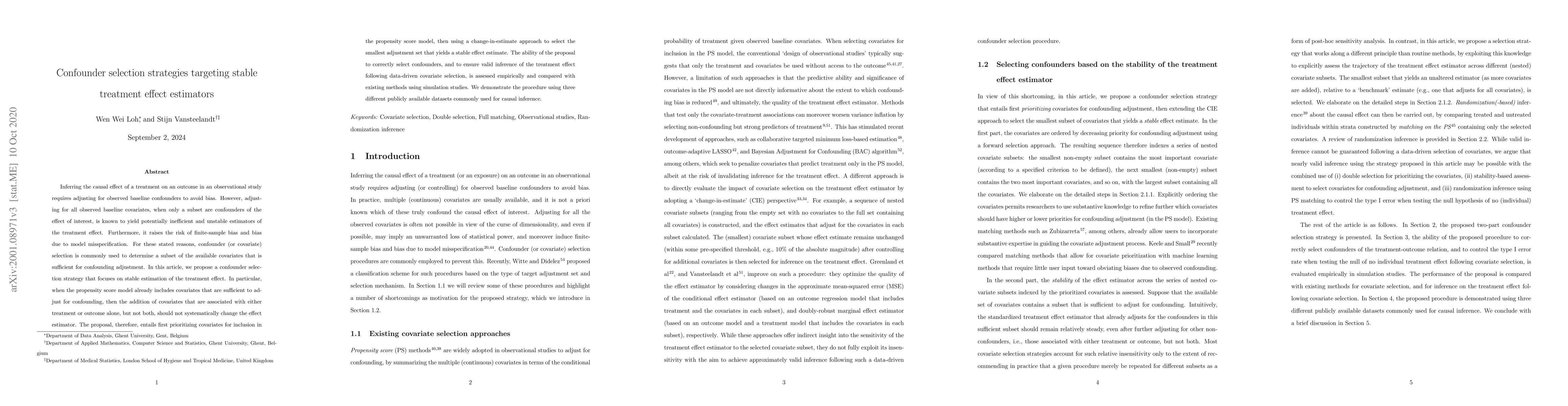 This paper proposes a confounder selection strategy aimed at stable treatment effect estimation, prioritizing covariates that do not alter the effect estimator when already sufficient confounders are included. The method is empirically assessed and compared to existing methods using simulation studies and real-world datasets.