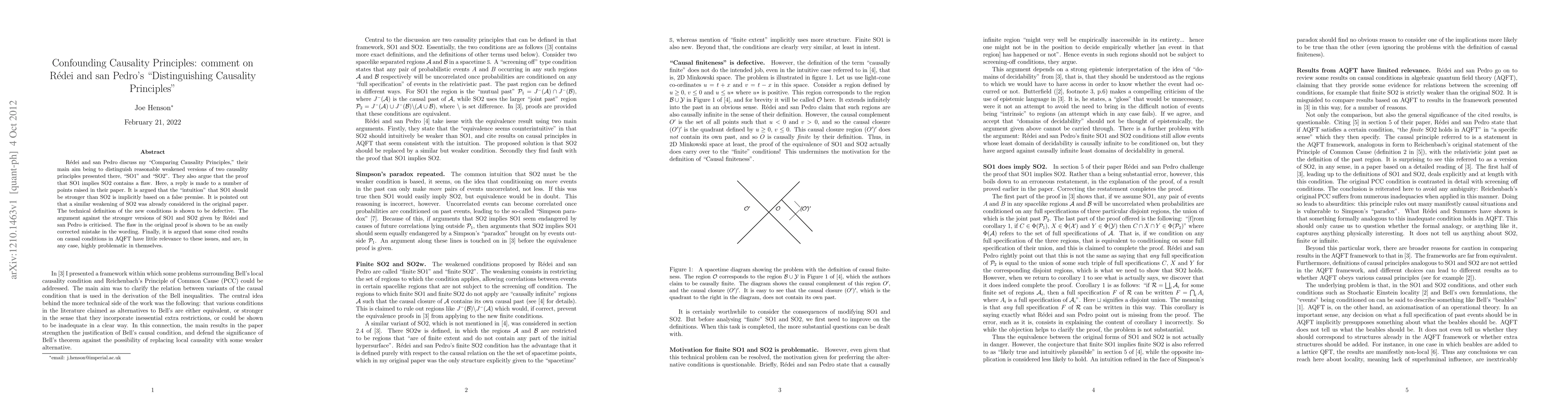 R\'edei and san Pedro discuss my "Comparing Causality Principles," their main aim being to distinguish reasonable weakened versions of two causality principles presented there, "SO1" and "SO2". They also argue that the proof that SO1 implies SO2 contains a flaw. Here, a reply is made to a number of points raised in their paper. It is argued that the "intuition" that SO1 should be stronger than SO2 is implicitly based on a false premise. It is pointed out that a similar weakening of SO2 was already considered in the original paper. The technical definition of the new conditions is shown to be defective. The argument against the stronger versions of SO1 and SO2 given by R\'edei and san Pedro is criticised. The flaw in the original proof is shown to be an easily corrected mistake in the wording. Finally, it is argued that some cited results on causal conditions in AQFT have little relevance to these issues, and are, in any case, highly problematic in themselves.