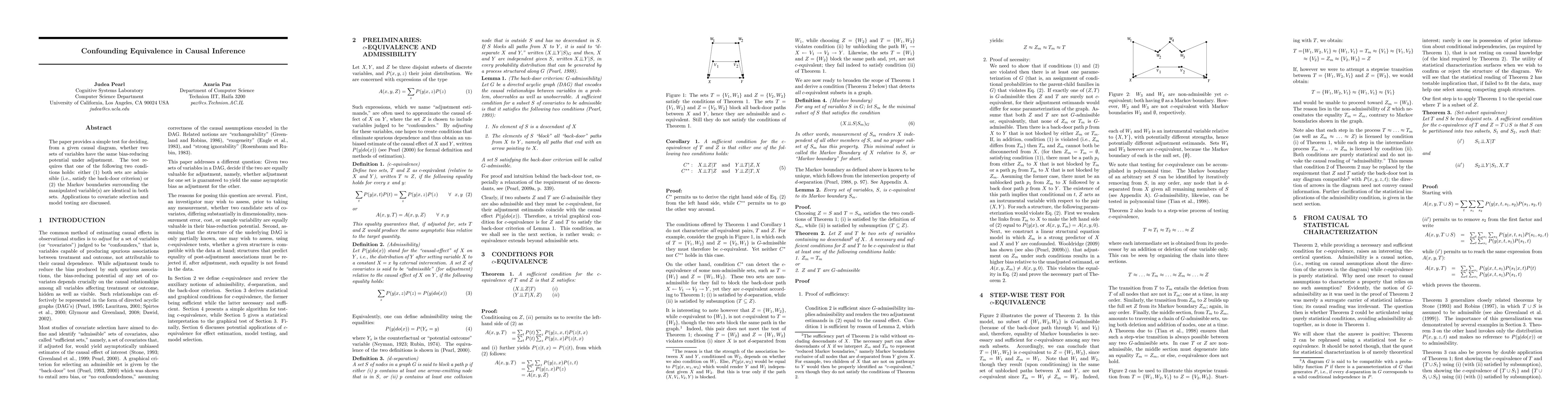 This paper introduces a straightforward test to determine if two variable sets have equal bias-reducing potential in causal inference, based on either both sets satisfying the back-door criterion or having identical Markov boundaries around manipulated variables. It also explores applications in covariate selection and model testing.