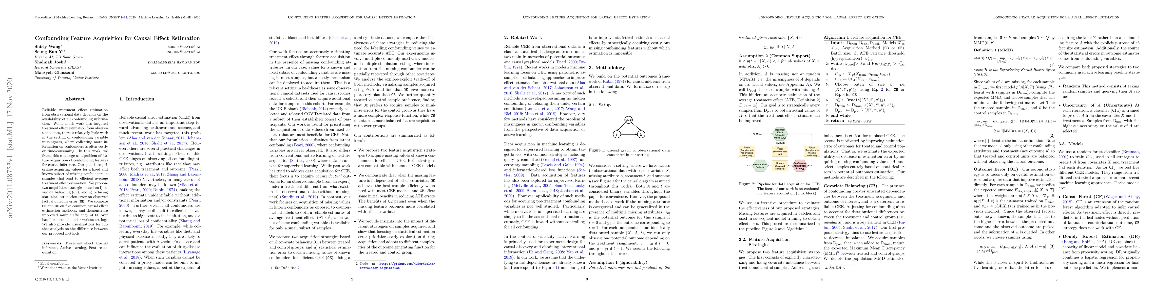 This paper proposes strategies to acquire values for missing confounders to improve causal effect estimation from observational data. It introduces two acquisition methods based on covariate balancing and reducing estimation error, demonstrating that the latter leads to better sample efficiency compared to baseline methods.
