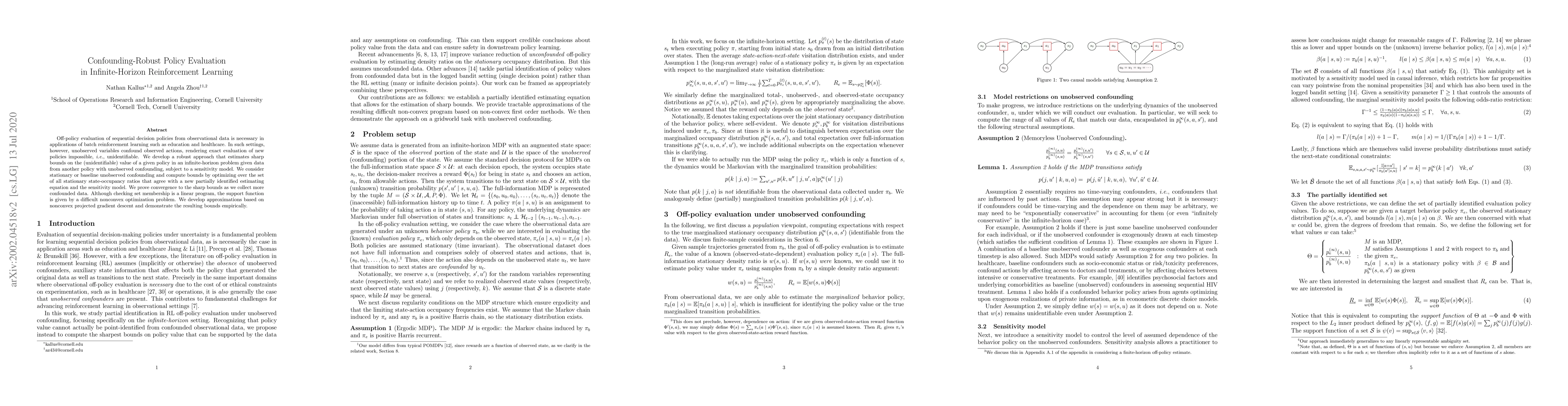 Off-policy evaluation of sequential decision policies from observational data is necessary in applications of batch reinforcement learning such as education and healthcare. In such settings, however, unobserved variables confound observed actions, rendering exact evaluation of new policies impossible, i.e., unidentifiable. We develop a robust approach that estimates sharp bounds on the (unidentifiable) value of a given policy in an infinite-horizon problem given data from another policy with unobserved confounding, subject to a sensitivity model. We consider stationary or baseline unobserved confounding and compute bounds by optimizing over the set of all stationary state-occupancy ratios that agree with a new partially identified estimating equation and the sensitivity model. We prove convergence to the sharp bounds as we collect more confounded data. Although checking set membership is a linear program, the support function is given by a difficult nonconvex optimization problem. We develop approximations based on nonconvex projected gradient descent and demonstrate the resulting bounds empirically.