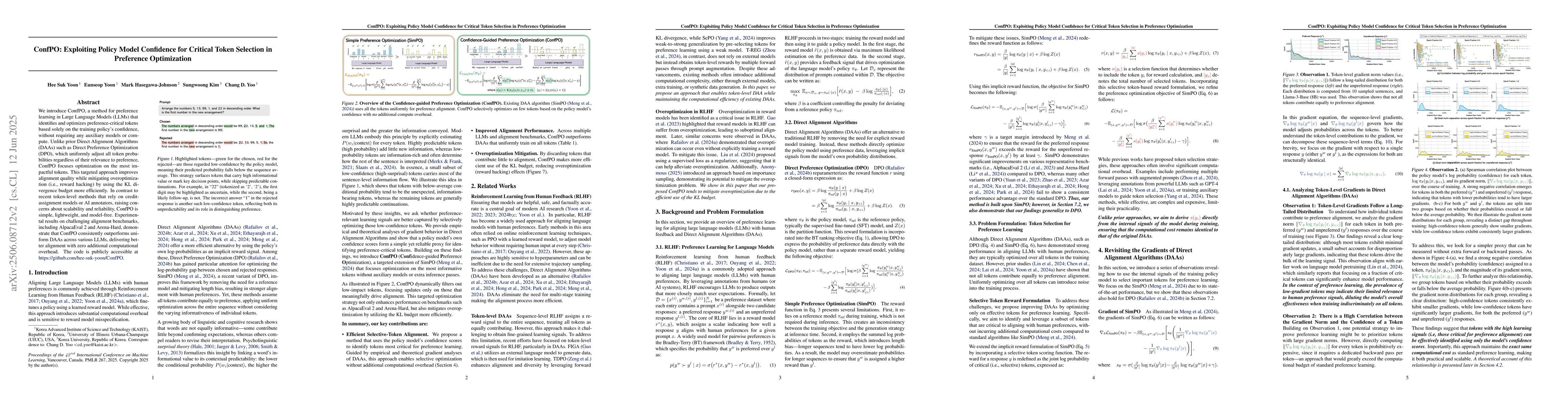 ConfPO optimizes preference learning in LLMs by targeting impactful tokens based on policy confidence, outperforming uniform DAAs with better alignment and zero additional computational overhead.