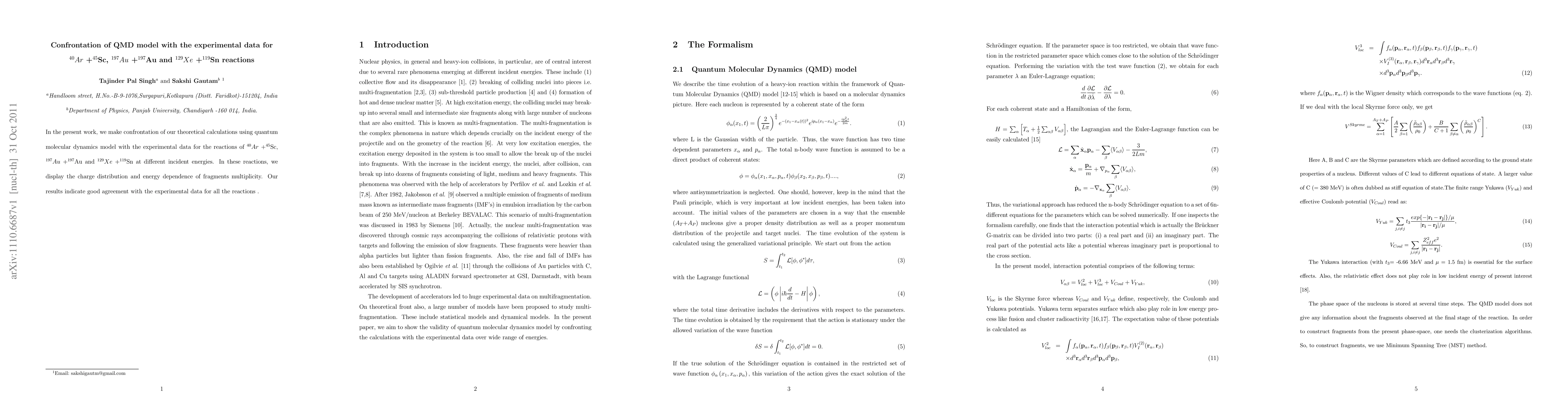 This paper compares theoretical calculations from the quantum molecular dynamics model with experimental data for three nuclear reactions: $^{40}Ar$ +$^{45}$Sc, $^{197}Au$ +$^{197}$Au, and $^{129}Xe$ +$^{119}$Sn. The study shows good agreement between the model's predictions of charge distribution and fragment multiplicity with experimental observations.