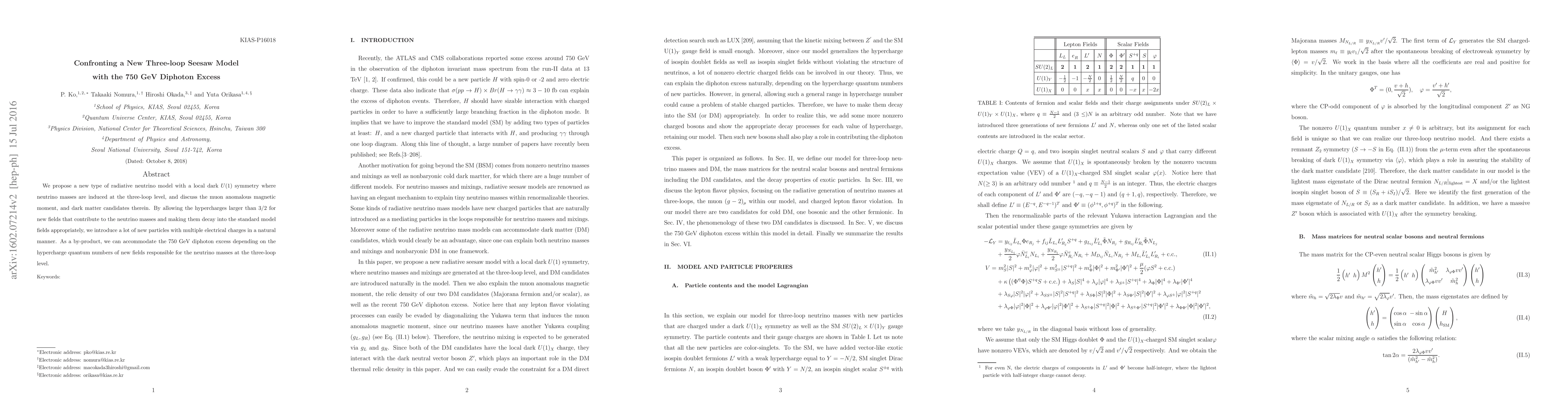 This paper introduces a novel three-loop seesaw model with local $U(1)$ symmetry, generating neutrino masses radiatively and explaining the 750 GeV diphoton excess via new particles. It also explores the muon anomalous magnetic moment and potential dark matter candidates within this framework.