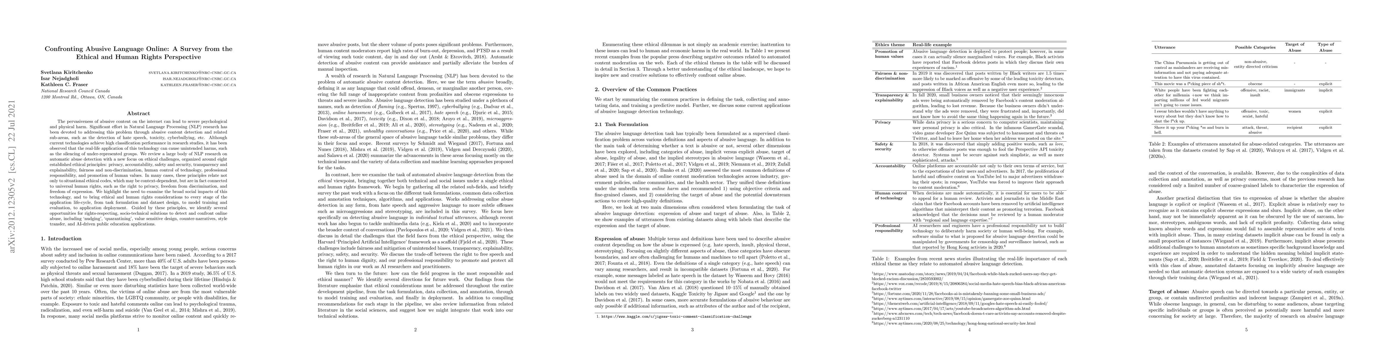 The pervasiveness of abusive content on the internet can lead to severe psychological and physical harm. Significant effort in Natural Language Processing (NLP) research has been devoted to addressing this problem through abusive content detection and related sub-areas, such as the detection of hate speech, toxicity, cyberbullying, etc. Although current technologies achieve high classification performance in research studies, it has been observed that the real-life application of this technology can cause unintended harms, such as the silencing of under-represented groups. We review a large body of NLP research on automatic abuse detection with a new focus on ethical challenges, organized around eight established ethical principles: privacy, accountability, safety and security, transparency and explainability, fairness and non-discrimination, human control of technology, professional responsibility, and promotion of human values. In many cases, these principles relate not only to situational ethical codes, which may be context-dependent, but are in fact connected to universal human rights, such as the right to privacy, freedom from discrimination, and freedom of expression. We highlight the need to examine the broad social impacts of this technology, and to bring ethical and human rights considerations to every stage of the application life-cycle, from task formulation and dataset design, to model training and evaluation, to application deployment. Guided by these principles, we identify several opportunities for rights-respecting, socio-technical solutions to detect and confront online abuse, including `nudging', `quarantining', value sensitive design, counter-narratives, style transfer, and AI-driven public education applications.