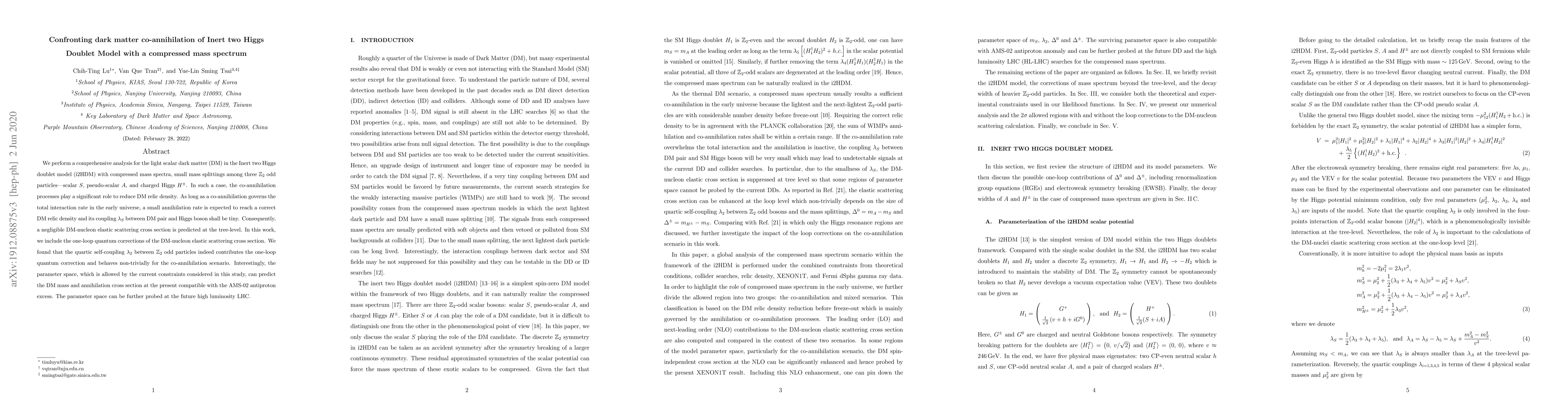 We perform a comprehensive analysis for the light scalar dark matter (DM)in the Inert two Higgs doublet model (i2HDM) with compressed mass spectra, small mass splittings among three $\mathbb{Z}_2$ odd particles---scalar $S$, pseudo-scalar $A$, and charged Higgs $H^\pm$. In such a case, the co-annihilation processes play a significant role to reduce DM relic density. As long as a co-annihilation governs the total interaction rate in the early universe, a small annihilation rate is expected to reach a correct DM relic density and its coupling $\lambda_S$ between DM pair and Higgs boson shall be tiny. Consequently, a negligible DM-nucleon elastic scattering cross section is predicted at the tree-level. In this work, we include the one-loop quantum corrections of the DM-nucleon elastic scattering cross section. We found that the quartic self-coupling $\lambda_2$ between $\mathbb{Z}_2$ odd particles indeed contributes to the one-loop quantum correction and behaves non-trivially for the co-annihilation scenario. Interestingly, the parameter space, which is allowed by the current constraints considered in this study, can predict the DM mass and annihilation cross section at the present compatible with the AMS-02 antiproton excess. The parameter space can be further probed at the future high luminosity LHC.