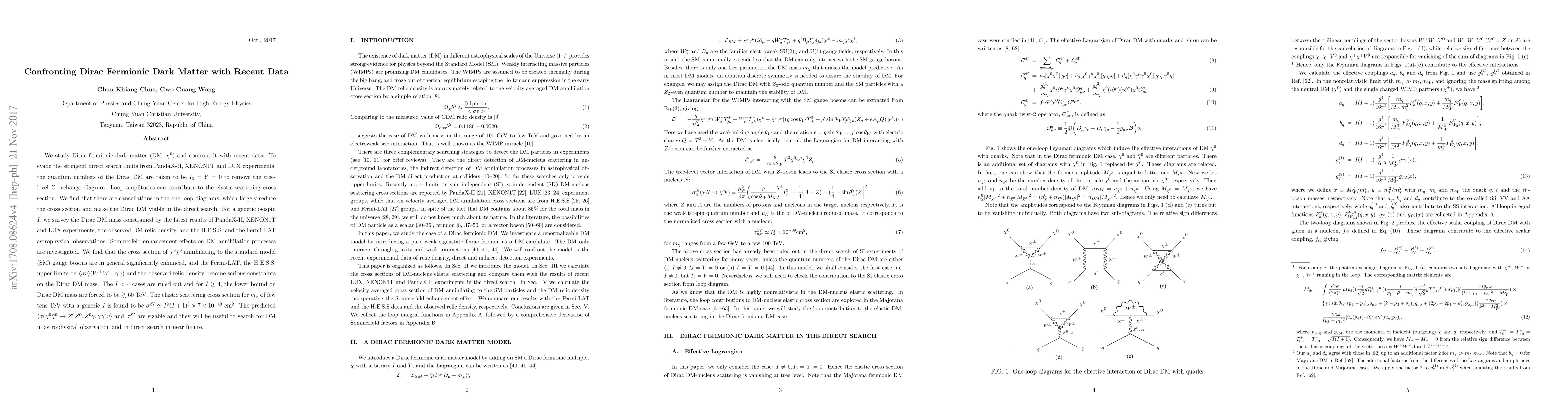 We study Dirac fermionic dark matter (DM, $\chi^0$) and confront it with recent data. To evade the stringent direct search limits from PandaX-II, XENON1T and LUX experiments, the quantum numbers of the Dirac DM are taken to be $I_3=Y=0$ to remove the tree-level $Z$-exchange diagram. Loop amplitudes can contribute to the elastic scattering cross section. We find that there are cancellations in the one-loop diagrams, which largely reduce the cross section and make the Dirac DM viable in the direct search. For a generic isospin $I$, we survey the Dirac DM mass constrained by the latest results of PandaX-II, XENON1T and LUX experiments, the observed DM relic density, and the H.E.S.S. and the Fermi-LAT astrophysical observations. Sommerfeld enhancement effects on DM annihilation processes are investigated. We find that the cross section of $\chi^0\bar\chi^0$ annihilating to the standard model (SM) gauge bosons are in general significantly enhanced, and the Fermi-LAT, the H.E.S.S. upper limits on $\langle\sigma v\rangle({W^+W^-,\gamma\gamma})$ and the observed relic density become serious constraints on the Dirac DM mass. The $I<4$ cases are ruled out and for $I\geq 4$, the lower bound on Dirac DM mass are forced to be $\gtrsim$ 60 TeV. The elastic scattering cross section for $m_\chi$ of few tens TeV with a generic $I$ is found to be $\sigma^{SI}\simeq I^2(I+1)^2\times7\times10^{-49}$~cm$^2$. The predicted $\langle\sigma (\chi^0\bar\chi^0\to Z^0Z^0, Z^0\gamma, \gamma\gamma)v\rangle$ and $\sigma^{SI}$ are sizable and they will be useful to search for DM in astrophysical observation and in direct search in near future.