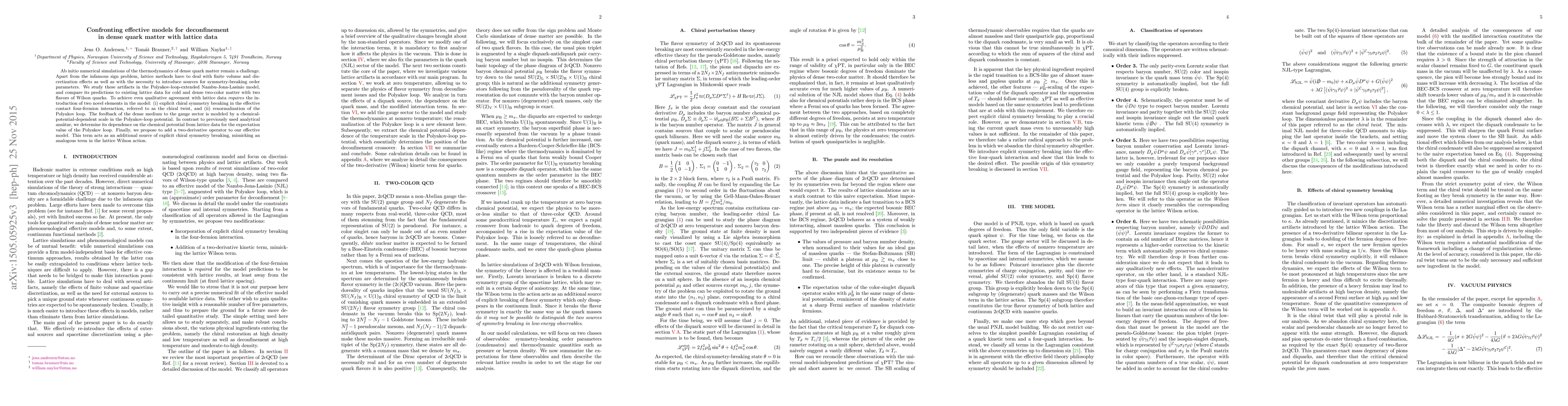 Ab initio numerical simulations of the thermodynamics of dense quark matter remain a challenge. Apart from the infamous sign problem, lattice methods have to deal with finite volume and discretization effects as well as with the necessity to introduce sources for symmetry-breaking order parameters. We study these artifacts in the Polyakov-loop-extended Nambu-Jona-Lasinio model, and compare its predictions to existing lattice data for cold and dense two-color matter with two flavors of Wilson quarks. To achieve even qualitative agreement with lattice data requires the introduction of two novel elements in the model: (i) explicit chiral symmetry breaking in the effective contact four-fermion interaction, referred to as the chiral twist, and (ii) renormalization of the Polyakov loop. The feedback of the dense medium to the gauge sector is modeled by a chemical-potential-dependent scale in the Polyakov-loop potential. In contrast to previously used analytical ansaetze, we determine its dependence on the chemical potential from lattice data for the expectation value of the Polyakov loop. Finally, we propose to add a two-derivative operator to our effective model. This term acts as an additional source of explicit chiral symmetry breaking, mimicking an analogous term in the lattice Wilson action.