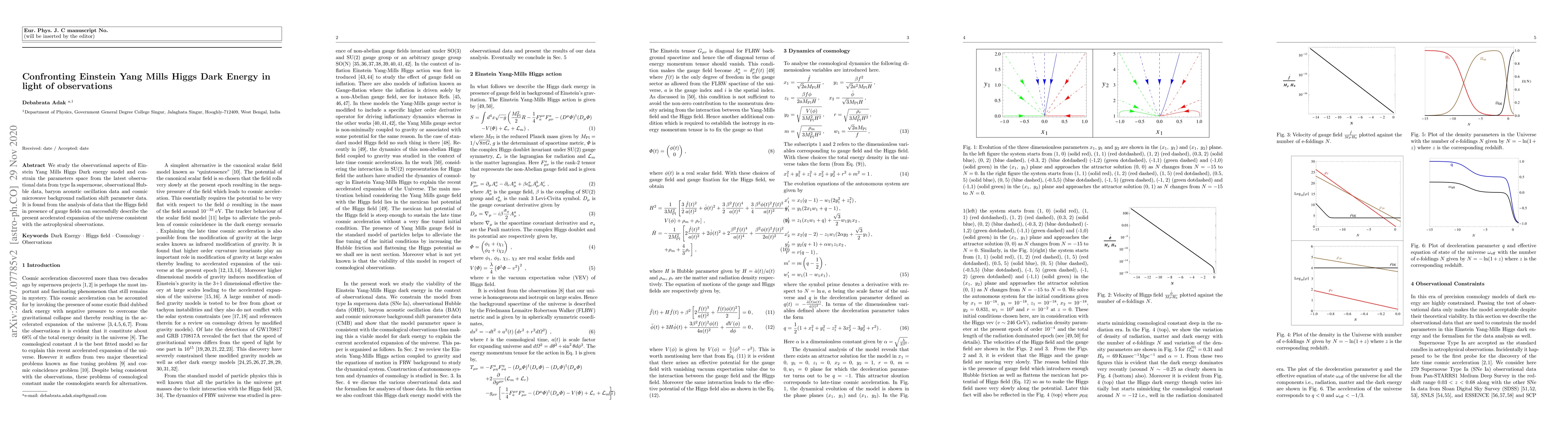 This study analyzes the Einstein Yang Mills Higgs Dark energy model, using recent observational data from supernovae, Hubble rates, baryon acoustic oscillations, and cosmic microwave background radiation. The findings suggest that the Higgs field combined with gauge fields can explain the universe's current accelerated expansion, aligning with astrophysical observations.