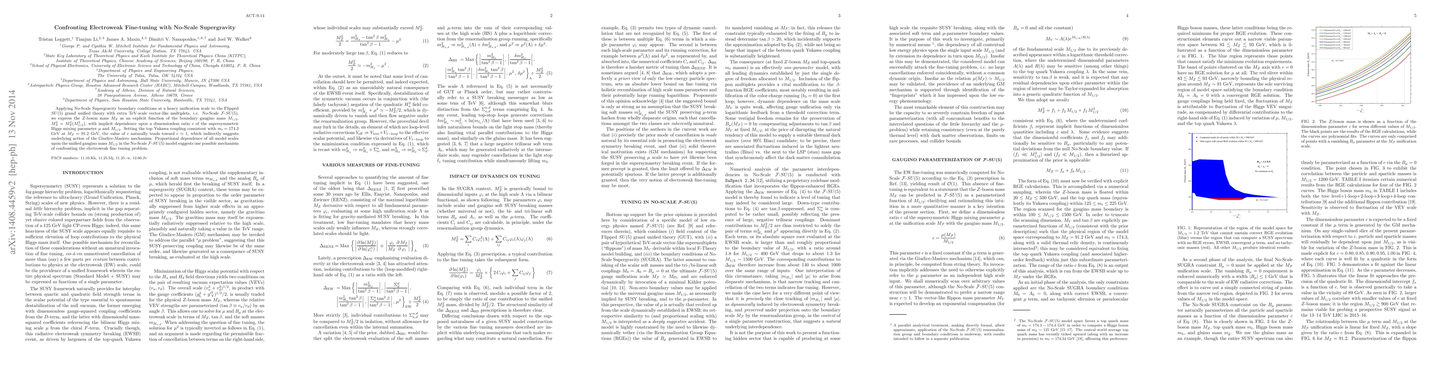 Applying No-Scale Supergravity boundary conditions at a heavy unification scale to the Flipped $SU(5)$ grand unified theory with extra TeV-scale vector-like multiplets, $i.e.$ No-Scale ${\cal F}$-$SU(5)$, we express the $Z$-boson mass $M_Z$ as an explicit function of the boundary gaugino mass $M_{1/2}$, $M_Z^2 = M_Z^2 (M_{1/2}^2)$, with implicit dependence upon a dimensionless ratio $c$ of the supersymmetric Higgs mixing parameter $\mu$ and $M_{1/2}$. Setting the top Yukawa coupling consistent with $m_t = 174.3$ GeV at $M_Z = 91.2$ GeV, the value of $c$ naturally tends toward $c \simeq 1$, which indirectly suggests underlying action of the Giudice-Masiero mechanism. Proportional dependence of all model scales upon the unified gaugino mass $M_{1/2}$ in the No-Scale ${\cal F}$-$SU(5)$ model suggests one possible mechanism of confronting the electroweak fine tuning problem.