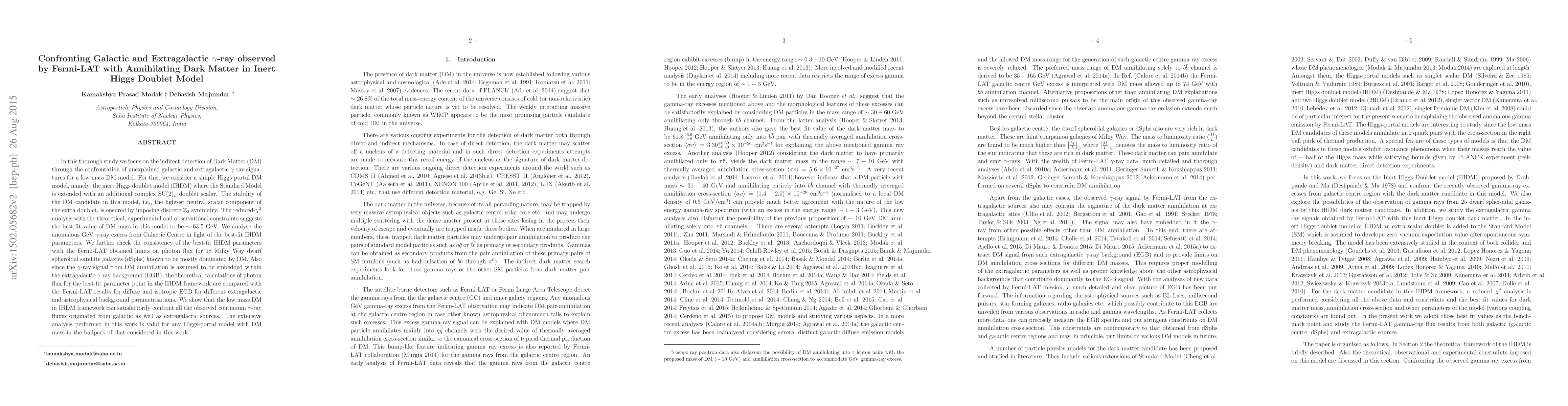 In this thorough study we focus on the indirect detection of Dark Matter (DM) through the confrontation of unexplained galactic and extragalactic $\gamma$-ray signatures for a low mass DM model. For this, we consider a simple Higgs-portal DM model, namely, the inert Higgs doublet model (IHDM) where the Standard Model is extended with an additional complex SU(2)$_L$ doublet scalar. The stability of the DM candidate in this model, i.e., the lightest neutral scalar component of the extra doublet, is ensured by imposing discrete $\mathbb{Z}_2$ symmetry. The reduced-$\chi^2$ analysis with the theoretical, experimental and observational constraints suggests the best-fit value of DM mass in this model to be $\sim$ 63.5 GeV. We analyse the anomalous GeV $\gamma$-ray excess from Galactic Centre in light of the best-fit IHDM parameters. We further check the consistency of the best-fit IHDM parameters with the Fermi-LAT obtained limits on photon flux for 18 Milky Way dwarf spheroidal satellite galaxies (dSphs) known to be mostly dominated by DM. Also since the $\gamma$-ray signal from DM annihilation is assumed to be embedded within the extragalactic $\gamma$-ray background (EGB), the theoretical calculations of photon flux for the best-fit parameter point in the IHDM framework are compared with the Fermi-LAT results for diffuse and isotropic EGB for different extragalactic and astrophysical background parametrisations. We show that the low mass DM in IHDM framework can satisfactorily confront all the observed continuum $\gamma$-ray fluxes originated from galactic as well as extragalactic sources. The extensive analysis performed in this work is valid for any Higgs-portal model with DM mass in the ballpark of that considered in this work.