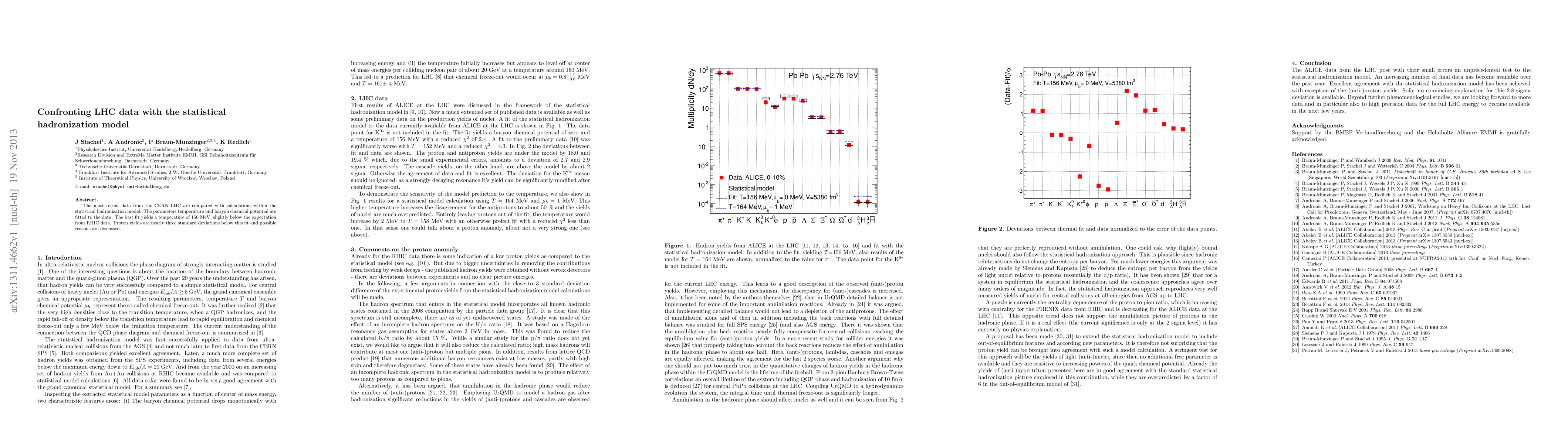 Researchers compared LHC data to a statistical hadronization model, finding a temperature of 156 MeV that's slightly lower than expected, with proton yields significantly below the predicted value.