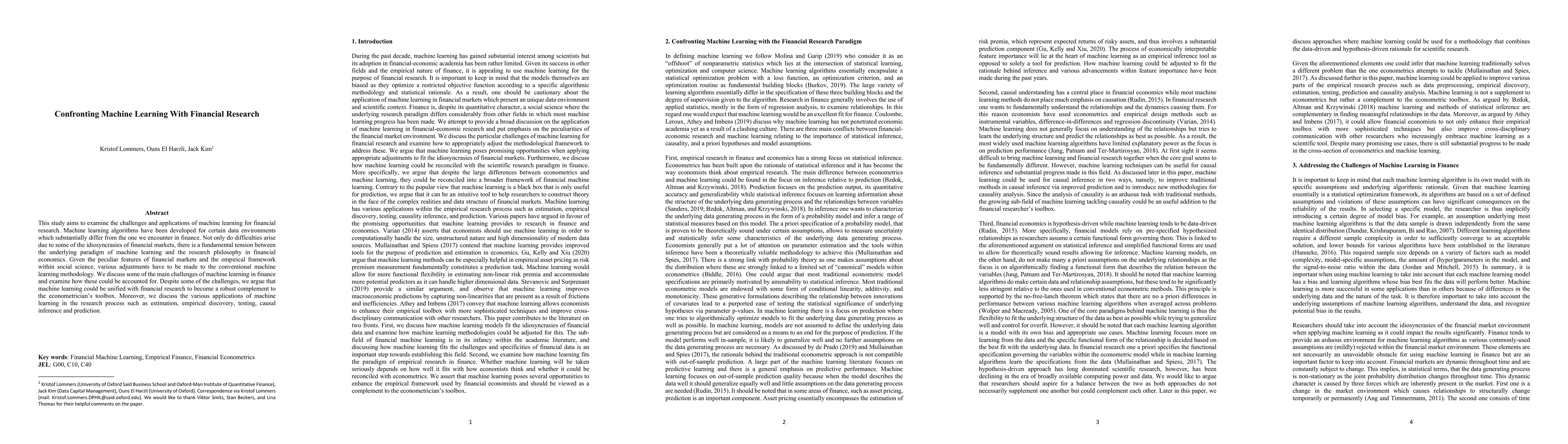 This study explores the challenges of applying machine learning to financial research, highlighting peculiarities in financial markets that require adjustments to conventional methodology. It argues that machine learning can complement econometric methods as a robust tool for finance research, with applications in estimation, discovery, testing, causal inference, and prediction.