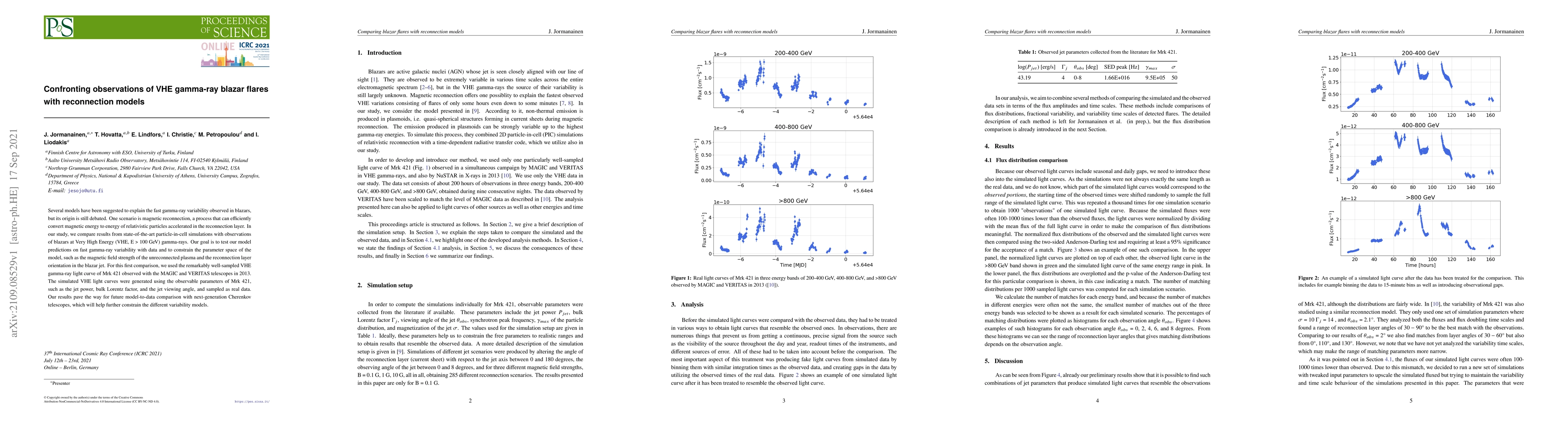 This study compares particle-in-cell simulations of magnetic reconnection with VHE gamma-ray observations of blazar flares, specifically using Mrk 421 data from 2013. The goal is to test model predictions and constrain parameters like magnetic field strength and reconnection layer orientation, paving the way for future model validations with advanced telescopes.