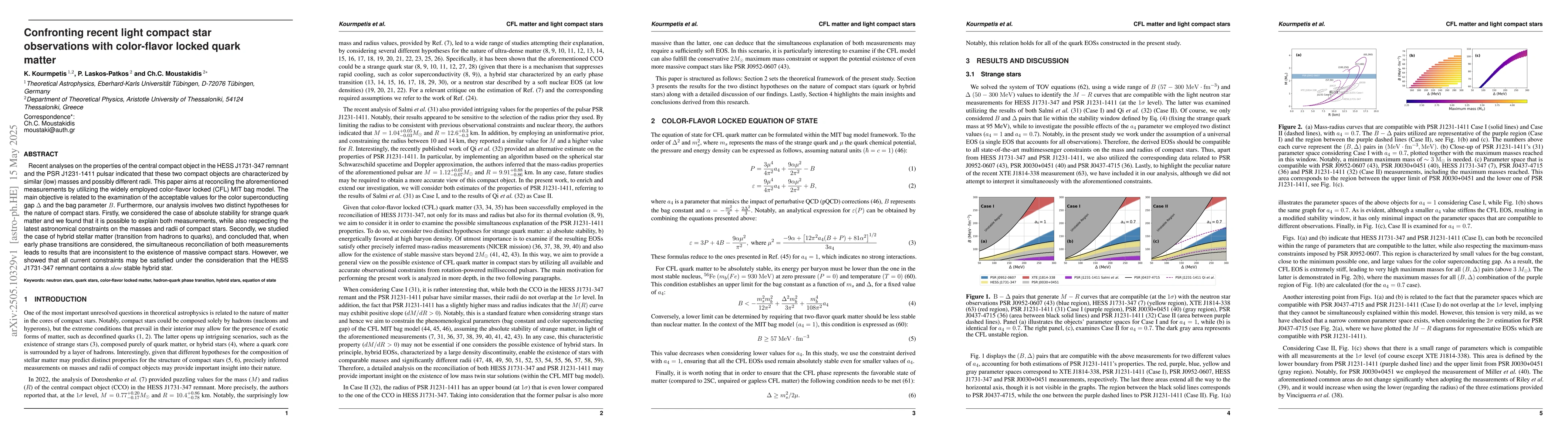 The paper employs the color-flavor locked (CFL) MIT bag model to analyze recent observations of compact objects in HESS J1731-347 and PSR J1231-1411, examining acceptable values for the color superconducting gap Δ and bag parameter B under two hypotheses: absolute stability for strange quark matter and hybrid stellar matter.