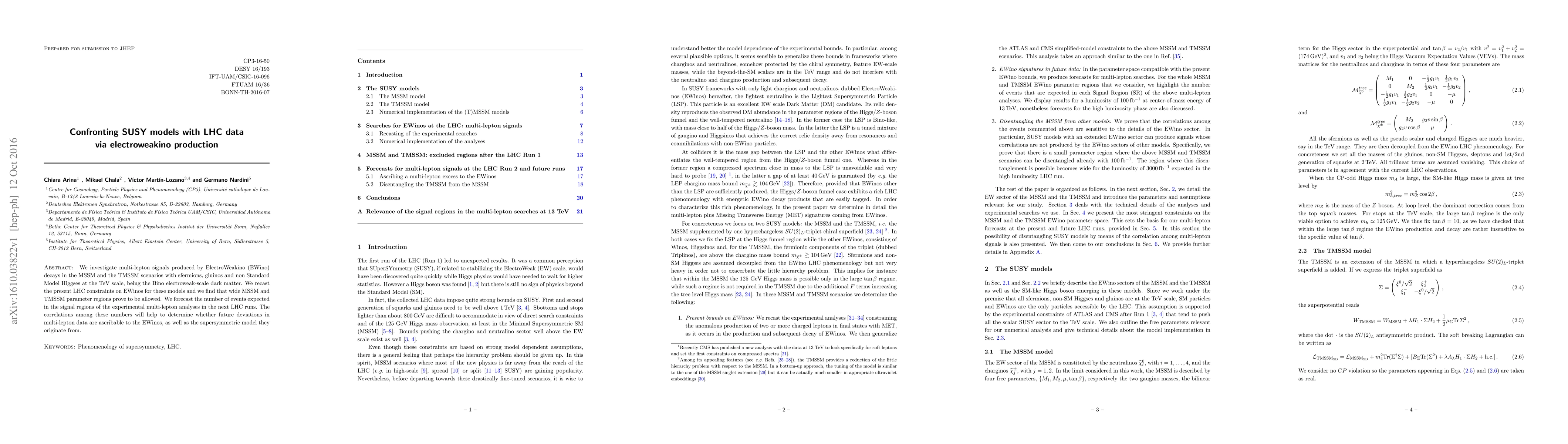 We investigate multi-lepton signals produced by ElectroWeakino (EWino) decays in the MSSM and the TMSSM scenarios with sfermions, gluinos and non Standard Model Higgses at the TeV scale, being the Bino electroweak-scale dark matter. We recast the present LHC constraints on EWinos for these models and we find that wide MSSM and TMSSM parameter regions prove to be allowed. We forecast the number of events expected in the signal regions of the experimental multi-lepton analyses in the next LHC runs. The correlations among these numbers will help to determine whether future deviations in multi-lepton data are ascribable to the EWinos, as well as the supersymmetric model they originate from.