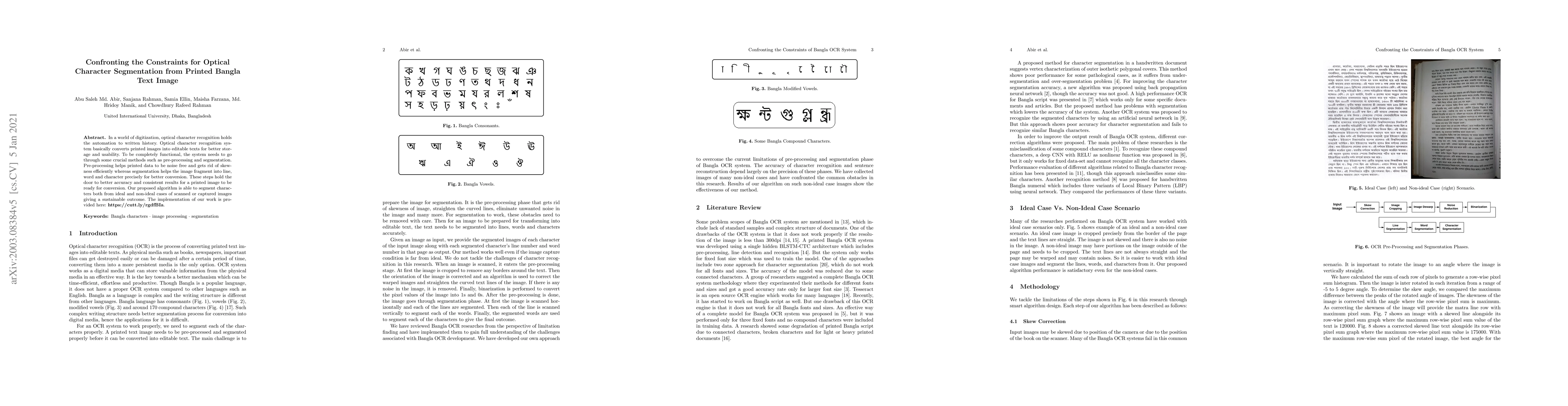 In a world of digitization, optical character recognition holds the automation to written history. Optical character recognition system basically converts printed images into editable texts for better storage and usability. To be completely functional, the system needs to go through some crucial methods such as pre-processing and segmentation. Pre-processing helps printed data to be noise free and gets rid of skewness efficiently whereas segmentation helps the image fragment into line, word and character precisely for better conversion. These steps hold the door to better accuracy and consistent results for a printed image to be ready for conversion. Our proposed algorithm is able to segment characters both from ideal and non-ideal cases of scanned or captured images giving a sustainable outcome. The implementation of our work is provided here: https://cutt.ly/rgdfBIa