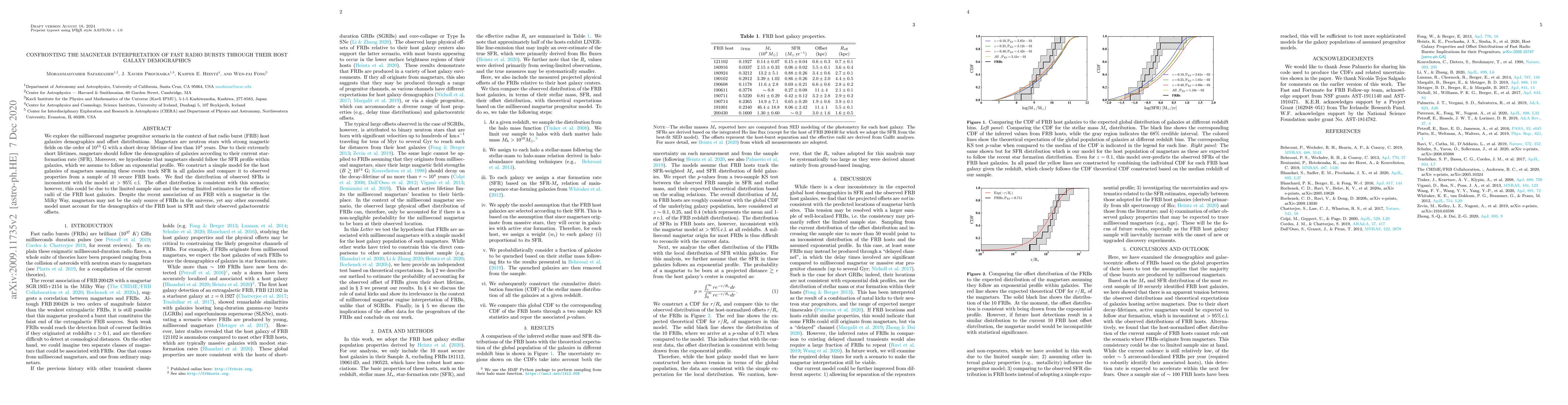 This paper examines the magnetar progenitor hypothesis for fast radio bursts (FRBs) by analyzing the demographics and offset distributions of FRB host galaxies. The study finds that the observed star-formation rates (SFRs) of FRB hosts do not align with the expected SFR profile of magnetar host galaxies, suggesting magnetars may not be the sole source of FRBs.