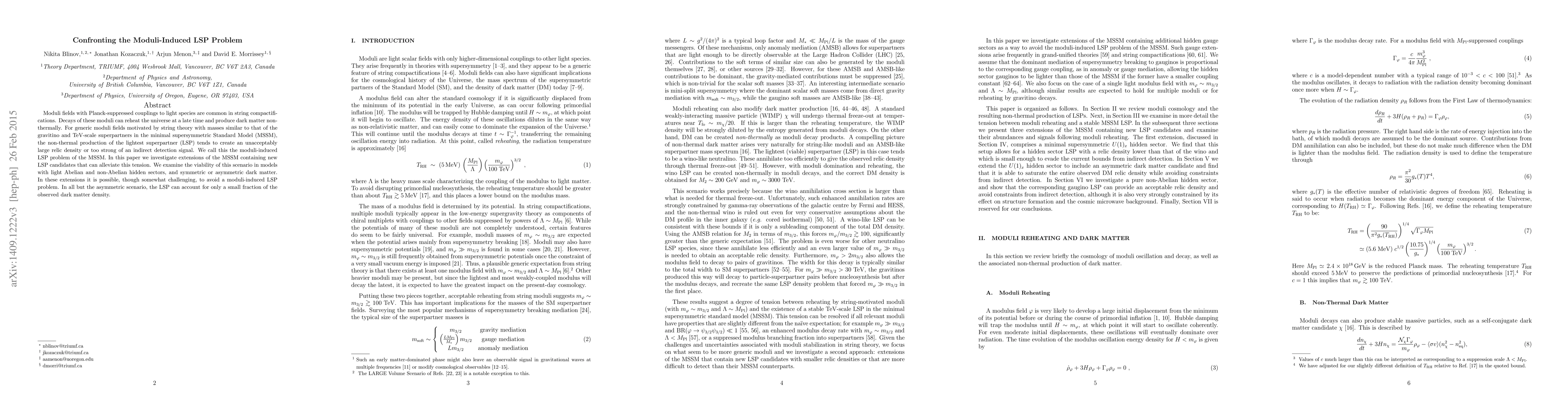 Researchers investigate a problem in string theory where moduli fields can produce too much dark matter, and explore ways to fix it by introducing new lightest superpartner candidates with models having hidden sectors or asymmetric dark matter.