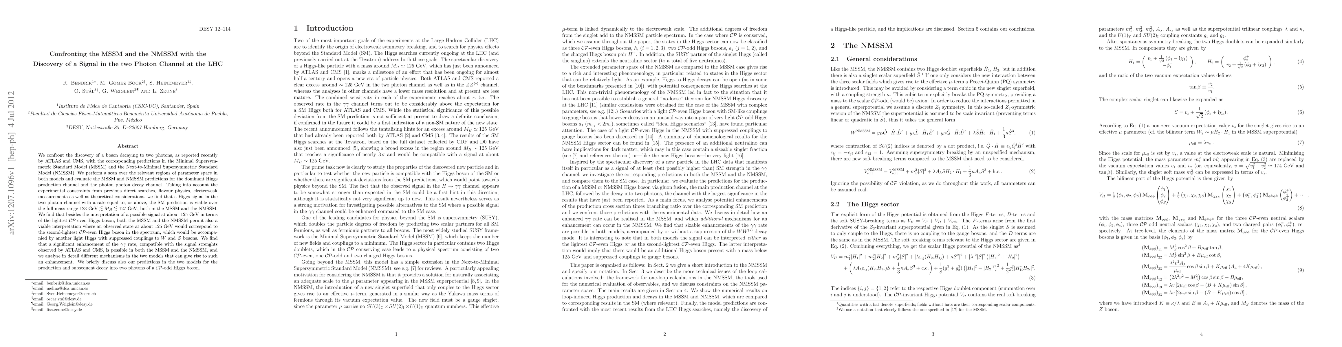 We confront the discovery of a boson decaying to two photons}, as reported recently by ATLAS and CMS, with the corresponding predictions in the Minimal Supersymmetric Standard Model (MSSM) and the Next-to-Minimal Supersymmetric Standard Model (NMSSM). We perform a scan over the relevant regions of parameter space in both models and evaluate the MSSM and NMSSM predictions for the dominant Higgs production channel and the photon photon decay channel. Taking into account the experimental constraints from previous direct searches, flavour physics, electroweak measurements as well as theoretical considerations, we find that a Higgs signal in the two photon channel with a rate equal to, or above, the SM prediction is viable over the full mass range $123\gev \lsim M_H \lsim 127\gev$, both in the MSSM and the NMSSM. We find that besides the interpretation of a possible signal at about $125\gev$ in terms of the lightest $\cp$-even Higgs boson, both the MSSM and the NMSSM permit also a viable interpretation where an observed state at about $125\gev$ would correspond to the second-lightest $\cp$-even Higgs boson in the spectrum, which would be accompanied by another light Higgs with suppressed couplings to $W$ and $Z$ bosons. We find that a significant enhancement of the $\ga\ga$ rate, compatible with the signal strenghts observed by ATLAS and CMS, is possible in both the MSSM and the NMSSM, and we analyse in detail different mechanisms in the two models that can give rise to such an enhancement. We briefly discuss also our predictions in the two models for the production and subsequent decay into two photons of a $\cp$-odd Higgs boson.
