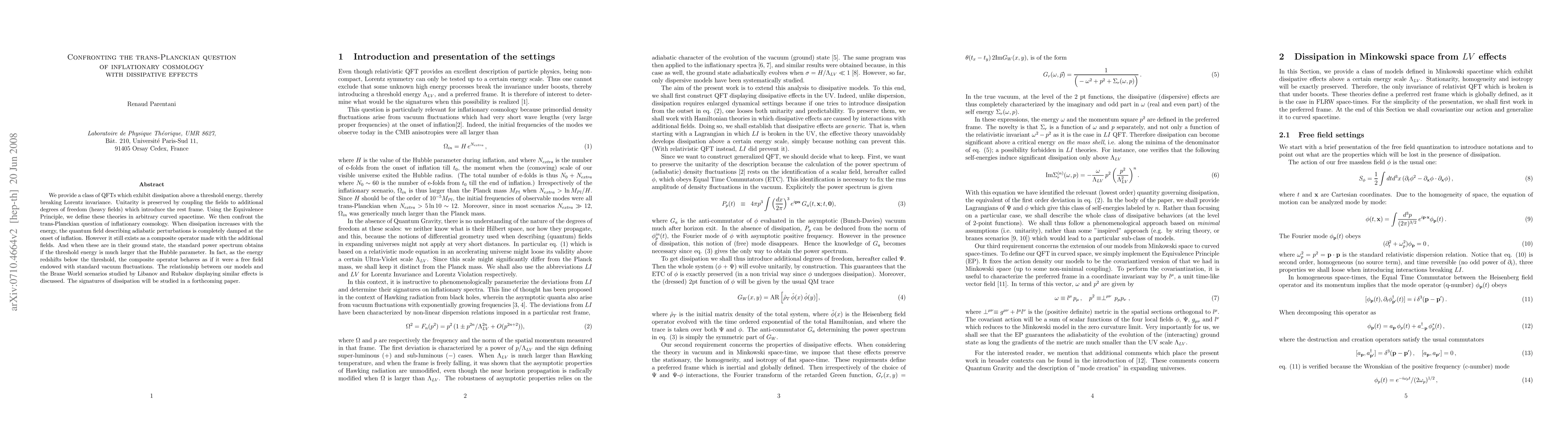We provide a class of QFTs which exhibit dissipation above a threshold energy, thereby breaking Lorentz invariance. Unitarity is preserved by coupling the fields to additional degrees of freedom (heavy fields) which introduce the rest frame. Using the Equivalence Principle, we define these theories in arbitrary curved spacetime. We then confront the trans-Planckian question of inflationary cosmology. When dissipation increases with the energy, the quantum field describing adiabatic perturbations is completely damped at the onset of inflation. However it still exists as a composite operator made with the additional fields. And when these are in their ground state, the standard power spectrum obtains if the threshold energy is much larger that the Hubble parameter. In fact, as the energy redshifts below the threshold, the composite operator behaves as if it were a free field endowed with standard vacuum fluctuations. The relationship between our models and the Brane World scenarios studied by Libanov and Rubakov displaying similar effects is discussed. The signatures of dissipation will be studied in a forthcoming paper.