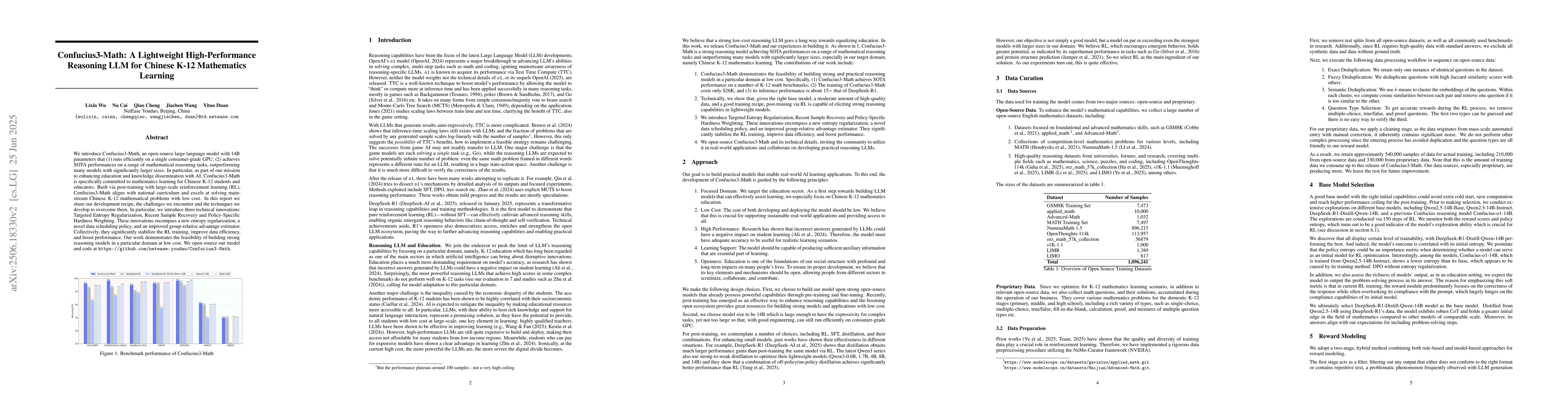 We introduce Confucius3-Math, an open-source large language model with 14B parameters that (1) runs efficiently on a single consumer-grade GPU; (2) achieves SOTA performances on a range of mathematical reasoning tasks, outperforming many models with significantly larger sizes. In particular, as part of our mission to enhancing education and knowledge dissemination with AI, Confucius3-Math is specifically committed to mathematics learning for Chinese K-12 students and educators. Built via post-training with large-scale reinforcement learning (RL), Confucius3-Math aligns with national curriculum and excels at solving main-stream Chinese K-12 mathematical problems with low cost. In this report we share our development recipe, the challenges we encounter and the techniques we develop to overcome them. In particular, we introduce three technical innovations: Targeted Entropy Regularization, Recent Sample Recovery and Policy-Specific Hardness Weighting. These innovations encompass a new entropy regularization, a novel data scheduling policy, and an improved group-relative advantage estimator. Collectively, they significantly stabilize the RL training, improve data efficiency, and boost performance. Our work demonstrates the feasibility of building strong reasoning models in a particular domain at low cost. We open-source our model and code at https://github.com/netease-youdao/Confucius3-Math.