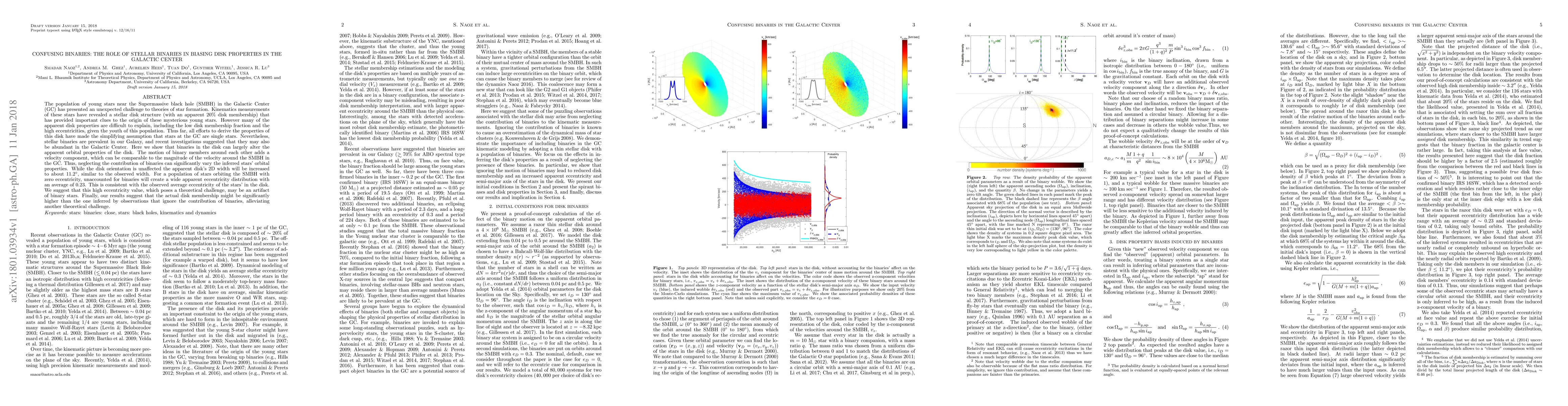 This paper investigates how stellar binaries in the Galactic Center's disk can significantly alter the apparent orbital properties of stars, potentially explaining the low disk membership fraction and high eccentricities observed. The presence of binaries increases the disk's apparent width and creates an apparent eccentricity distribution, suggesting that the actual disk membership might be higher than previously inferred.