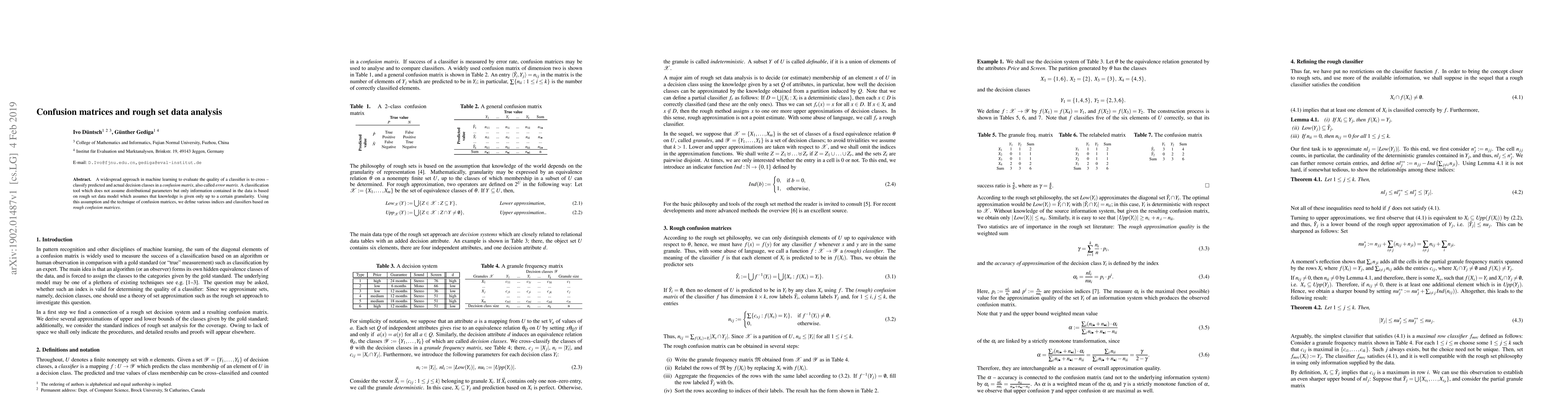 A widespread approach in machine learning to evaluate the quality of a classifier is to cross -- classify predicted and actual decision classes in a confusion matrix, also called error matrix. A classification tool which does not assume distributional parameters but only information contained in the data is based on the rough set data model which assumes that knowledge is given only up to a certain granularity. Using this assumption and the technique of confusion matrices, we define various indices and classifiers based on rough confusion matrices.