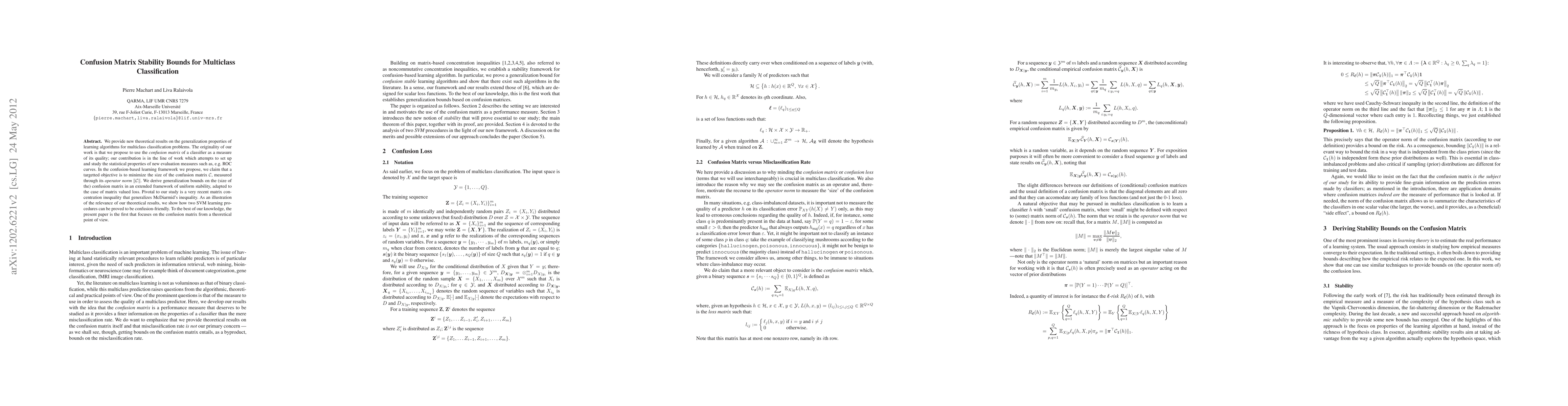 This paper introduces new theoretical results on the generalization properties of multiclass classification algorithms, proposing the confusion matrix as a quality measure and deriving generalization bounds for its size using matrix concentration inequalities. The study also demonstrates the applicability of these bounds to SVM learning procedures.