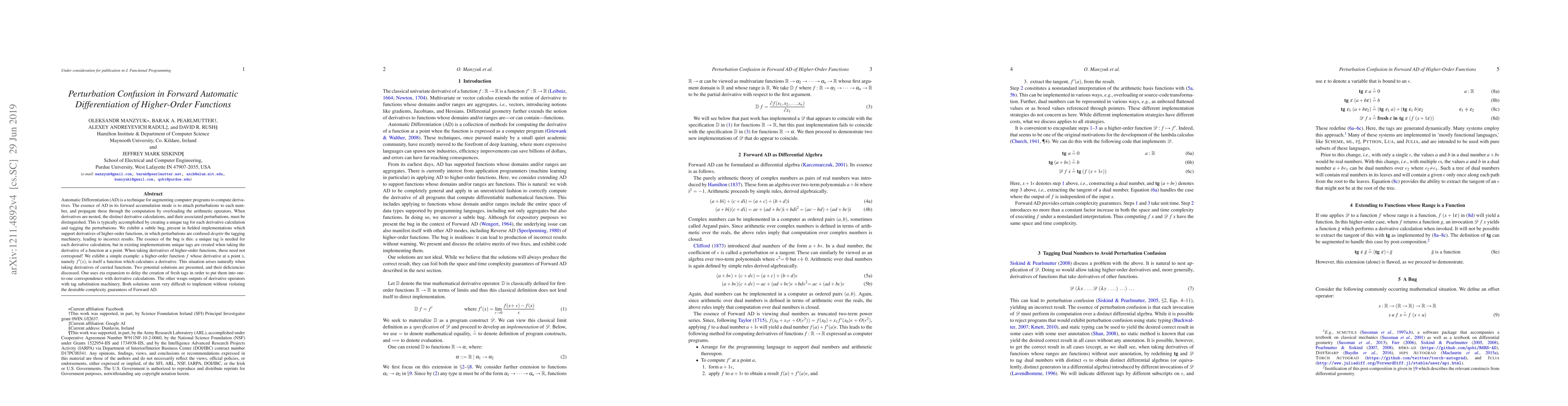 This paper identifies a subtle bug in fielded implementations of Forward Automatic Differentiation (AD) where tagged perturbations are incorrectly confused, particularly when computing derivatives of higher-order functions. The paper proposes two potential solutions but highlights their significant drawbacks, including complexity and implementation challenges.
