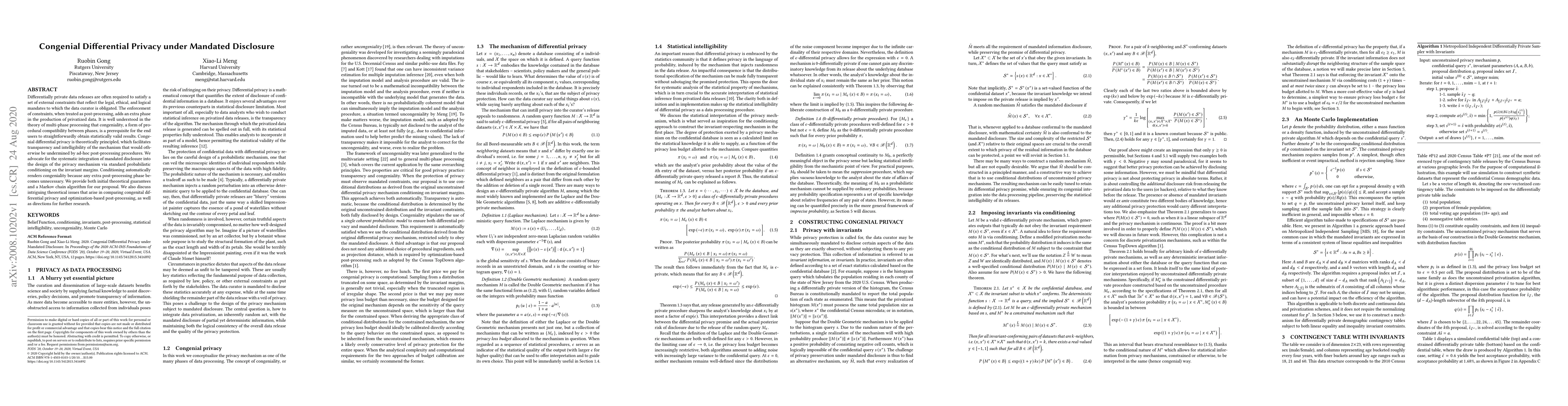 This paper proposes a method for integrating mandated disclosure into differential privacy mechanisms to ensure congeniality, thereby simplifying the process and enhancing transparency. It introduces a probabilistic conditioning approach that eliminates the need for post-processing, providing theoretical guarantees and a Markov chain algorithm to support the method.